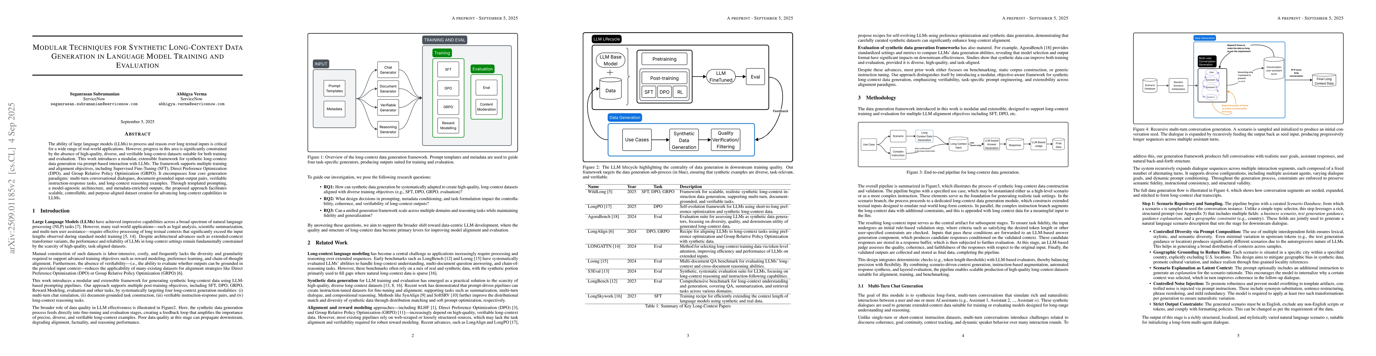 The ability of large language models (LLMs) to process and reason over long textual inputs is critical for a wide range of real-world applications. However, progress in this area is significantly constrained by the absence of high-quality, diverse, and verifiable long-context datasets suitable for both training and evaluation. This work introduces a modular, extensible framework for synthetic long-context data generation via prompt-based interaction with LLMs. The framework supports multiple training and alignment objectives, including Supervised Fine-Tuning (SFT), Direct Preference Optimization (DPO), and Group Relative Policy Optimization (GRPO). It encompasses four core generation paradigms: multi-turn conversational dialogues, document-grounded input-output pairs, verifiable instruction-response tasks, and long-context reasoning examples. Through templated prompting, a model-agnostic architecture, and metadata-enriched outputs, the proposed approach facilitates scalable, controllable, and purpose-aligned dataset creation for advancing long-context capabilities in LLMs.