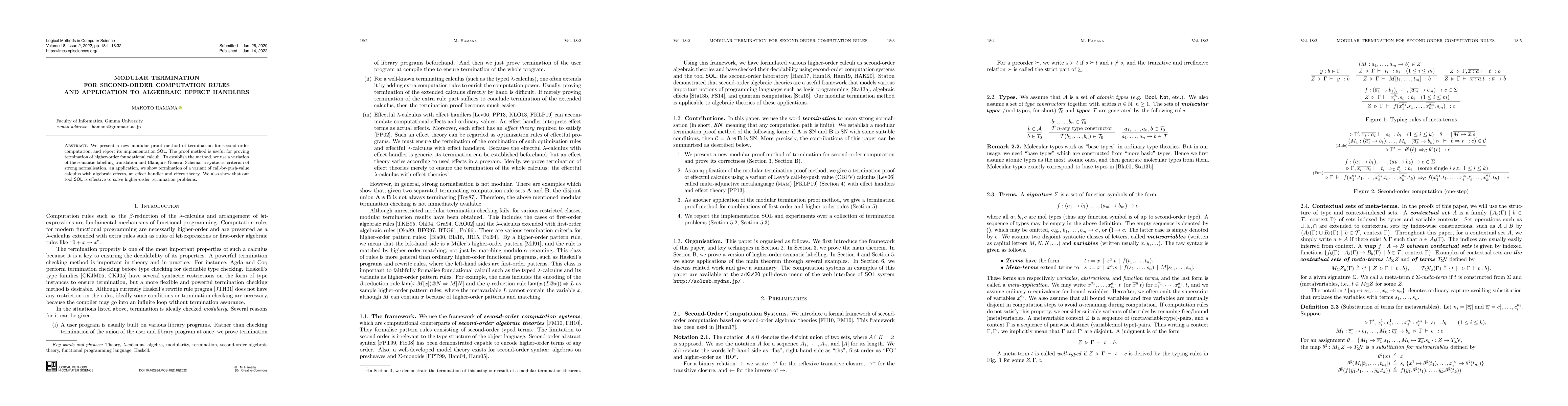 This paper introduces a new modular proof method for termination in second-order computation, implemented in SOL, which leverages semantic labelling and Blanqui's General Schema. It demonstrates the method's effectiveness by proving termination for a call-by-push-value calculus with algebraic effects and handlers.