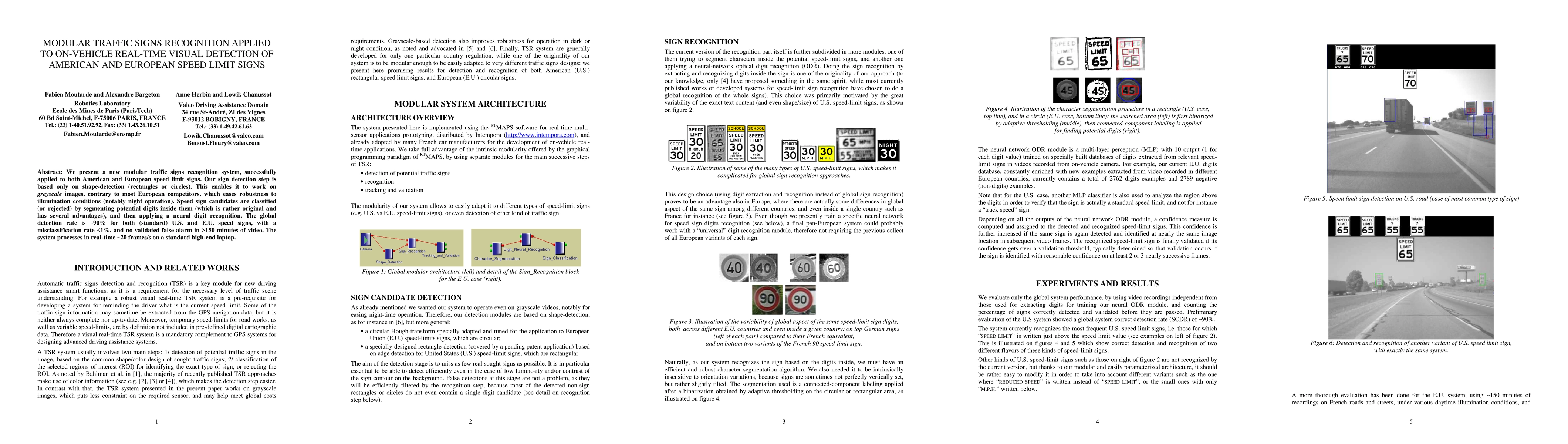We present a new modular traffic signs recognition system, successfully applied to both American and European speed limit signs. Our sign detection step is based only on shape-detection (rectangles or circles). This enables it to work on grayscale images, contrary to most European competitors, which eases robustness to illumination conditions (notably night operation). Speed sign candidates are classified (or rejected) by segmenting potential digits inside them (which is rather original and has several advantages), and then applying a neural digit recognition. The global detection rate is ~90% for both (standard) U.S. and E.U. speed signs, with a misclassification rate <1%, and no validated false alarm in >150 minutes of video. The system processes in real-time ~20 frames/s on a standard high-end laptop.