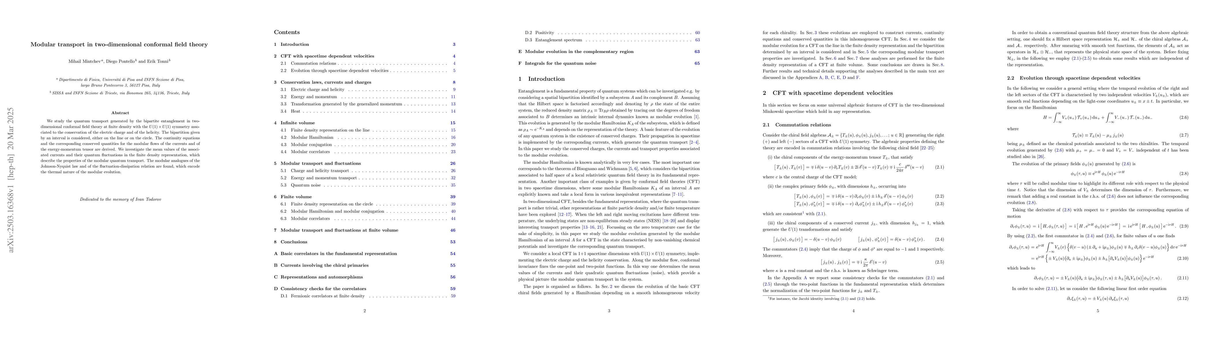 The research employs two-dimensional conformal field theory (CFT) with $U(1) imes U(1)$ symmetry to study modular transport induced by bipartite entanglement at finite density. The study considers intervals on both the line and the circle, deriving continuity equations and conserved quantities for modular flows of currents and energy-momentum tensors.