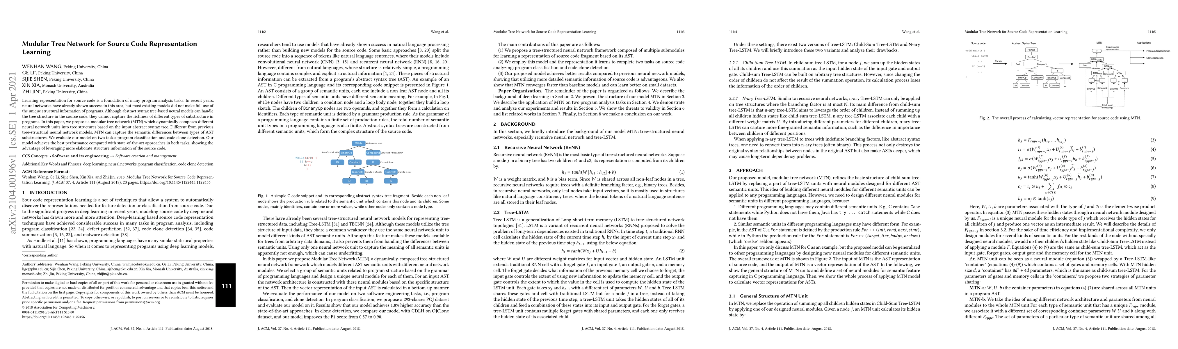 This paper proposes a modular tree network (MTN) to better represent source code by dynamically composing neural units based on the input abstract syntax tree, capturing semantic differences in substructures. The MTN outperforms existing models in program classification and code clone detection, demonstrating the benefits of utilizing detailed structural information.