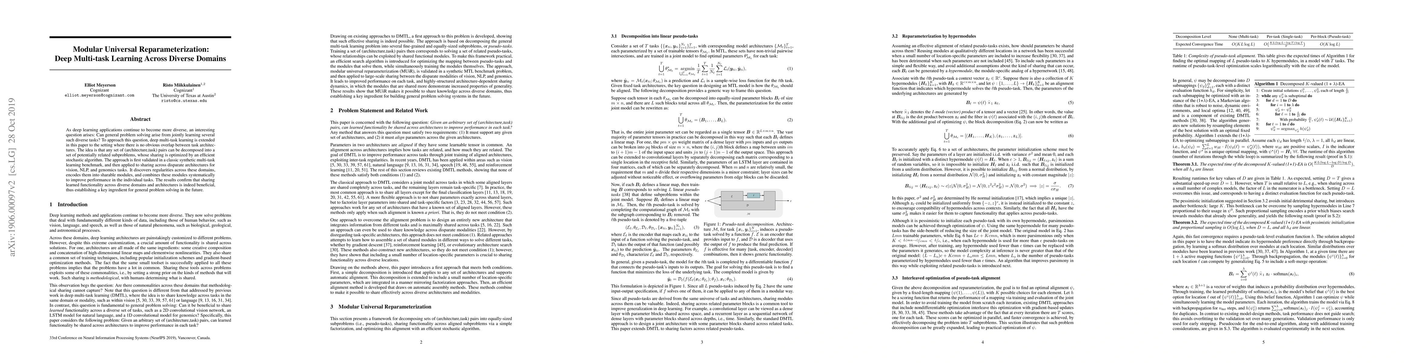 This paper proposes a modular universal reparameterization technique for deep multi-task learning across diverse domains, demonstrating that sharing learned functionality across disparate architectures in vision, NLP, and genomics can improve individual task performance. The method decomposes diverse tasks into related subproblems and optimizes their sharing, showing benefits for general problem solving.
