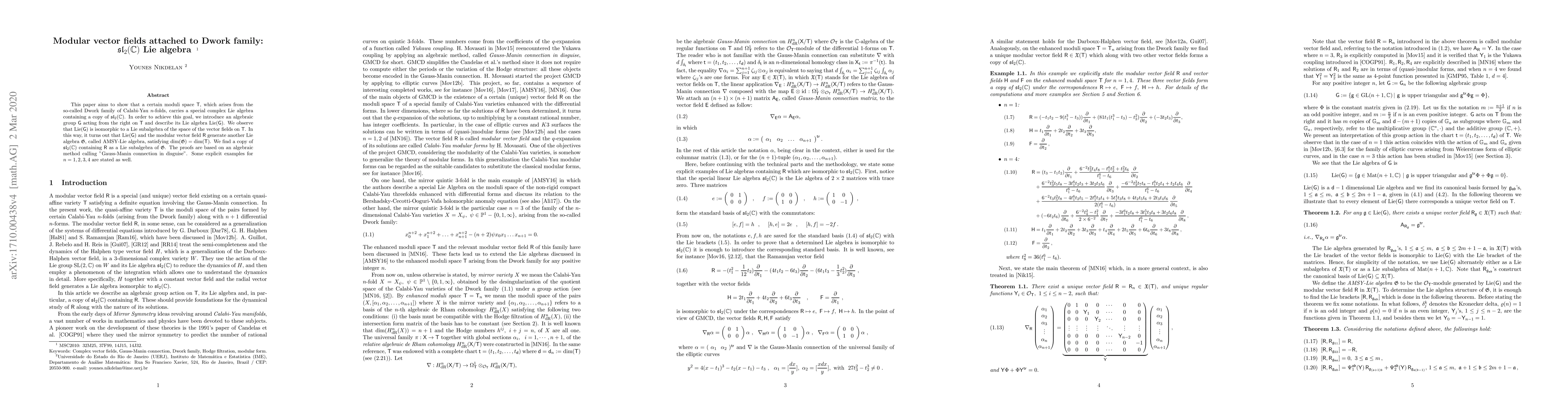 This paper aims to show that a certain moduli space $\textsf{T}$, which arises from the so-called Dwork family of Calabi-Yau $n$-folds, carries a special complex Lie algebra containing a copy of $\mathfrak{sl}_2(\mathbb{C})$. In order to achieve this goal, we introduce an algebraic group $\sf G$ acting from the right on $\textsf{T}$ and describe its Lie algebra ${\rm Lie}({\sf G})$. We observe that ${\rm Lie}({\sf G})$ is isomorphic to a Lie subalgebra of the space of the vector fields on $\textsf{T}$. In this way, it turns out that ${\rm Lie}({\sf G})$ and the modular vector field ${\sf R}$ generate another Lie algebra $\mathfrak{G}$, called AMSY-Lie algebra, satisfying $\dim (\mathfrak{G})=\dim (\textsf{T})$. We find a copy of $\mathfrak{sl}_2(\mathbb{C})$ containing ${\sf R}$ as a Lie subalgebra of $\mathfrak{G}$. The proofs are based on an algebraic method calling "Gauss-Manin connection in disguise". Some explicit examples for $n=1,2,3,4$ are stated as well.