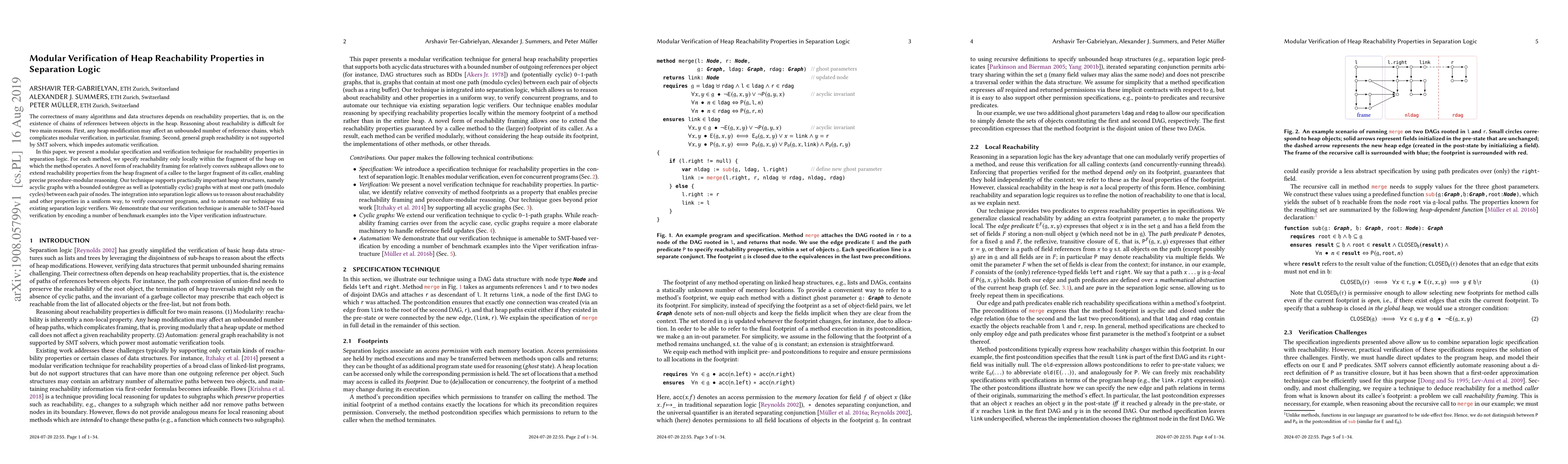 This paper presents a modular verification technique for heap reachability properties in separation logic, addressing the challenges of framing and lack of support from SMT solvers. It uses local reachability specifications and a novel framing method for convex subheaps to enable precise modular reasoning, and integrates with existing separation logic verifiers for automated verification.