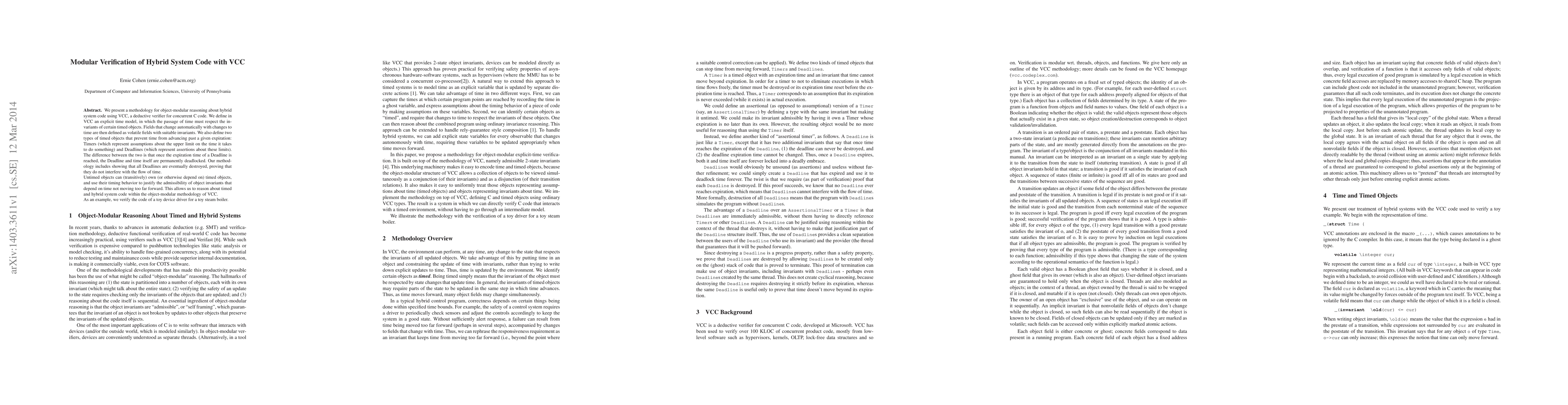 We present a methodology for object-modular reasoning about hybrid system code using VCC, a deductive verifier for concurrent C code. We define in VCC an explicit time model, in which the passage of time must respect the invariants of certain timed objects. Fields that change automatically with changes to time are then defined as volatile fields with suitable invariants. We also define two types of timed objects that prevent time from advancing past a given expiration: Timers (which represent assumptions about the upper limit on the time it takes to do something) and Deadlines (which represent assertions about these limits). The difference between the two is that once the expiration time of a Deadline is reached, the Deadline and time itself are permanently deadlocked. Our methodology includes showing that all Deadlines are eventually destroyed, proving that they do not interfere with the flow of time.