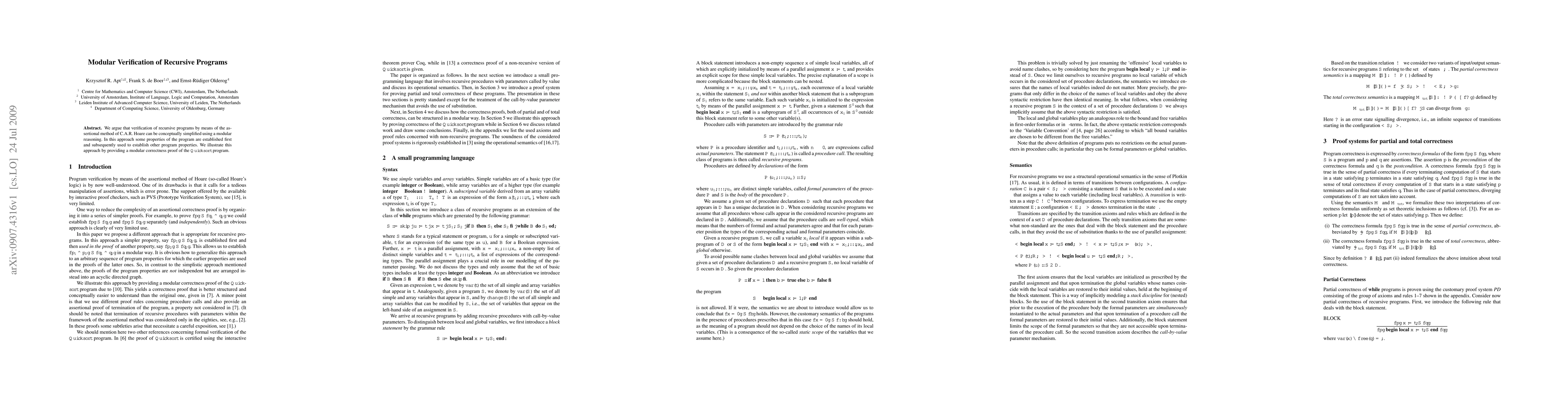 The paper proposes simplifying verification of recursive programs using modular reasoning, establishing some properties first to help verify others, and demonstrates this with a modular correctness proof for the Quicksort algorithm.