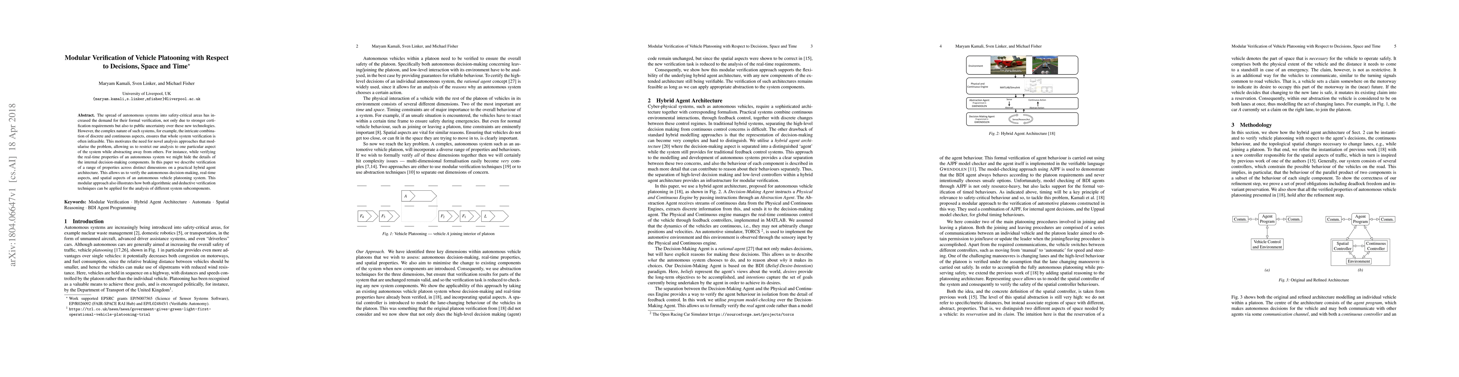 The spread of autonomous systems into safety-critical areas has increased the demand for their formal verification, not only due to stronger certification requirements but also to public uncertainty over these new technologies. However, the complex nature of such systems, for example, the intricate combination of discrete and continuous aspects, ensures that whole system verification is often infeasible. This motivates the need for novel analysis approaches that modularise the problem, allowing us to restrict our analysis to one particular aspect of the system while abstracting away from others. For instance, while verifying the real-time properties of an autonomous system we might hide the details of the internal decision-making components. In this paper we describe verification of a range of properties across distinct dimesnions on a practical hybrid agent architecture. This allows us to verify the autonomous decision-making, real-time aspects, and spatial aspects of an autonomous vehicle platooning system. This modular approach also illustrates how both algorithmic and deductive verification techniques can be applied for the analysis of different system subcomponents.