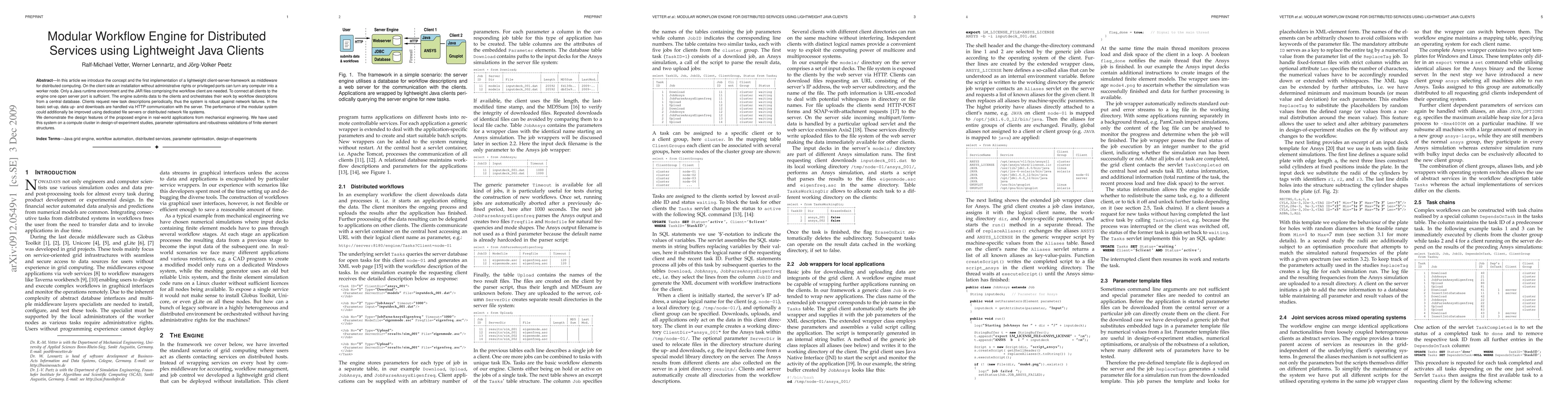 In this article we introduce the concept and the first implementation of a lightweight client-server-framework as middleware for distributed computing. On the client side an installation without administrative rights or privileged ports can turn any computer into a worker node. Only a Java runtime environment and the JAR files comprising the workflow client are needed. To connect all clients to the engine one open server port is sufficient. The engine submits data to the clients and orchestrates their work by workflow descriptions from a central database. Clients request new task descriptions periodically, thus the system is robust against network failures. In the basic set-up, data up- and downloads are handled via HTTP communication with the server. The performance of the modular system could additionally be improved using dedicated file servers or distributed network file systems. We demonstrate the design features of the proposed engine in real-world applications from mechanical engineering. We have used this system on a compute cluster in design-of-experiment studies, parameter optimisations and robustness validations of finite element structures.