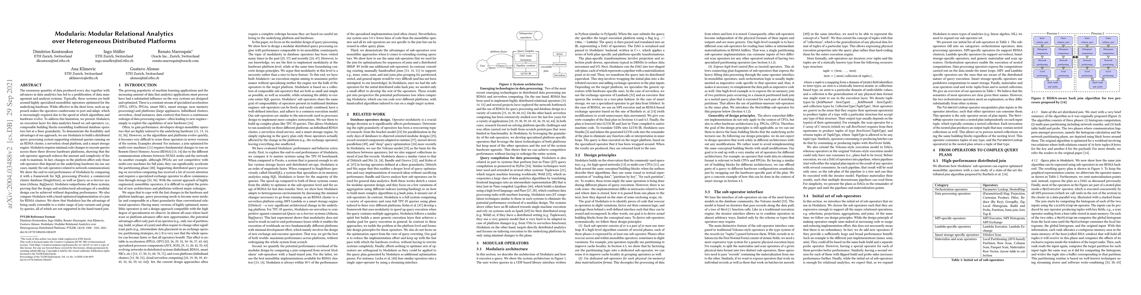 Modularis introduces an execution layer for data analytics using sub-operators, enabling efficient query processing across diverse hardware platforms with minimal code changes. It outperforms traditional systems in performance and offers greater extensibility for various query types.