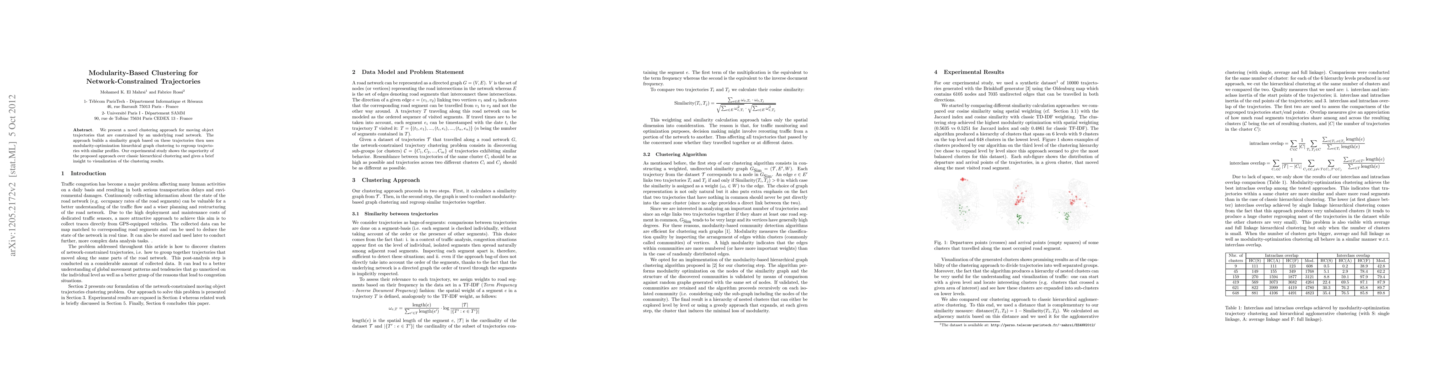 This paper introduces a modularity-based hierarchical clustering method for road network-constrained moving object trajectories, demonstrating its effectiveness through experimental comparisons with traditional hierarchical clustering and visualization of results.