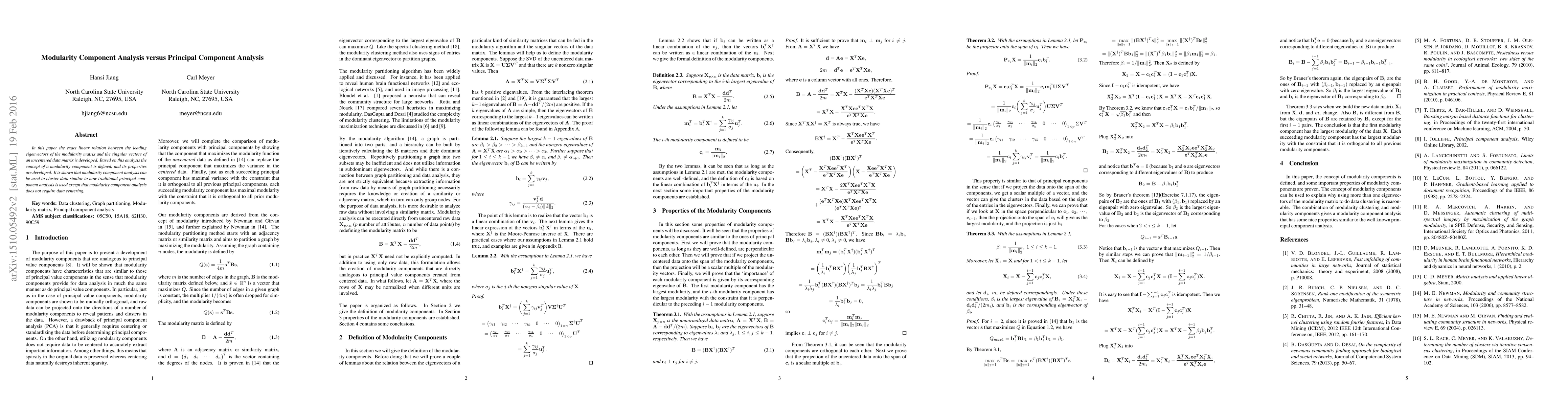 This paper explores the linear relationship between modularity matrix eigenvectors and data matrix singular vectors, defining a modularity component. It demonstrates that modularity component analysis can cluster data without data centering, akin to principal component analysis but with distinct properties.