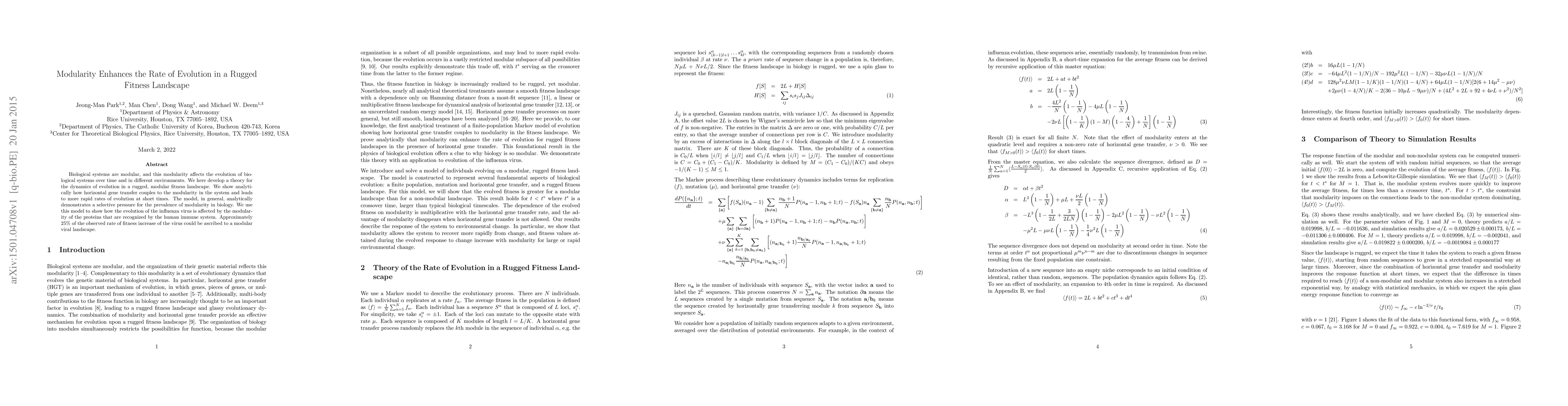 This paper develops a theoretical framework to demonstrate that modularity in biological systems accelerates evolution, particularly in rugged fitness landscapes, through horizontal gene transfer. The model shows that modularity exerts a selective pressure, enhancing the short-term evolutionary rate, and applies this to the influenza virus, attributing about 25% of its fitness increase to its modular protein structure.