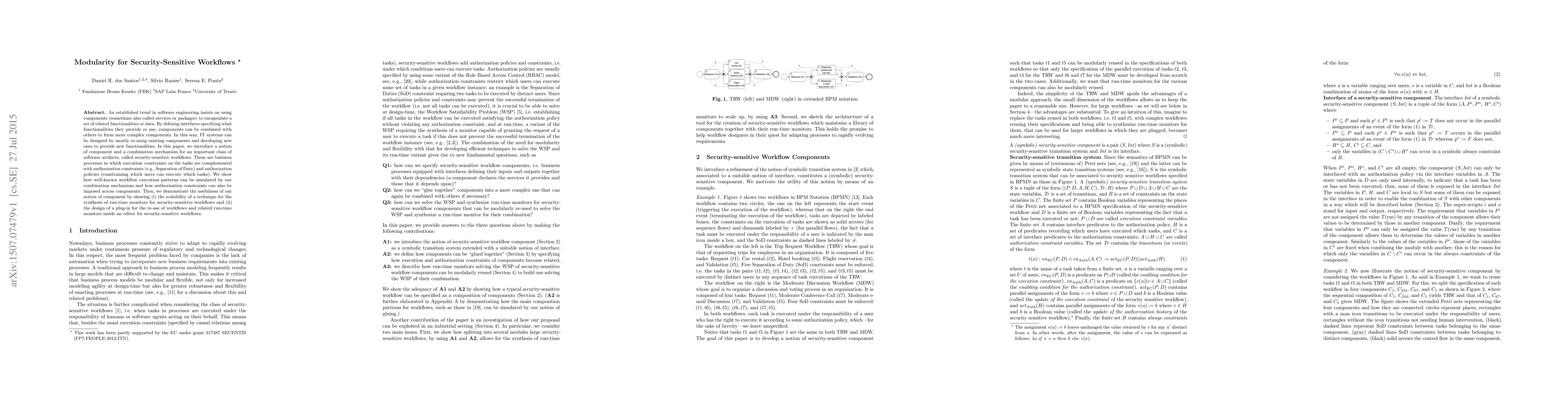 An established trend in software engineering insists on using components (sometimes also called services or packages) to encapsulate a set of related functionalities or data. By defining interfaces specifying what functionalities they provide or use, components can be combined with others to form more complex components. In this way, IT systems can be designed by mostly re-using existing components and developing new ones to provide new functionalities. In this paper, we introduce a notion of component and a combination mechanism for an important class of software artifacts, called security-sensitive workflows. These are business processes in which execution constraints on the tasks are complemented with authorization constraints (e.g., Separation of Duty) and authorization policies (constraining which users can execute which tasks). We show how well-known workflow execution patterns can be simulated by our combination mechanism and how authorization constraints can also be imposed across components. Then, we demonstrate the usefulness of our notion of component by showing (i) the scalability of a technique for the synthesis of run-time monitors for security-sensitive workflows and (ii) the design of a plug-in for the re-use of workflows and related run-time monitors inside an editor for security-sensitive workflows.