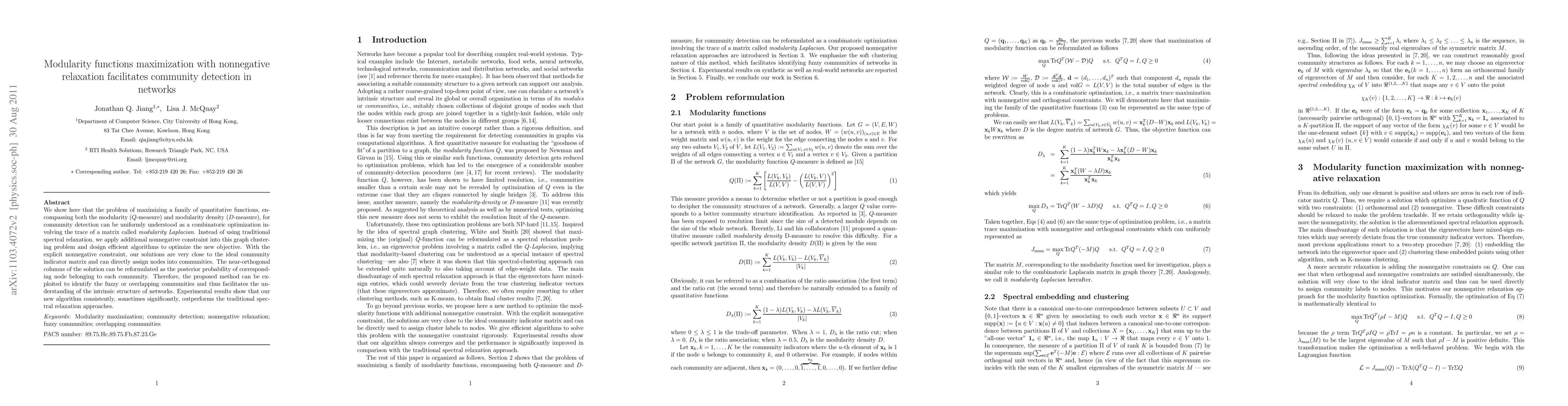 A new approach to community detection in networks maximizes modularity functions with nonnegative relaxation, outperforming traditional spectral methods and facilitating the identification of fuzzy or overlapping communities.