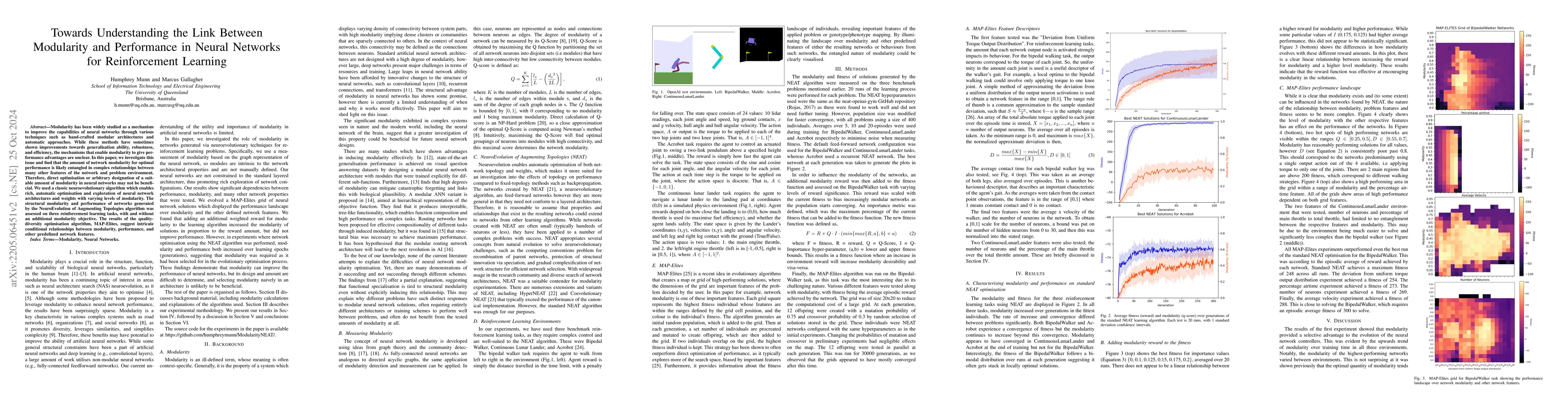 NEAT reinforcement learning networks exhibit rapid increases in modularity over time, but a direct relationship between modularity and performance is not established, suggesting that ideal modularity levels depend on other network variables.