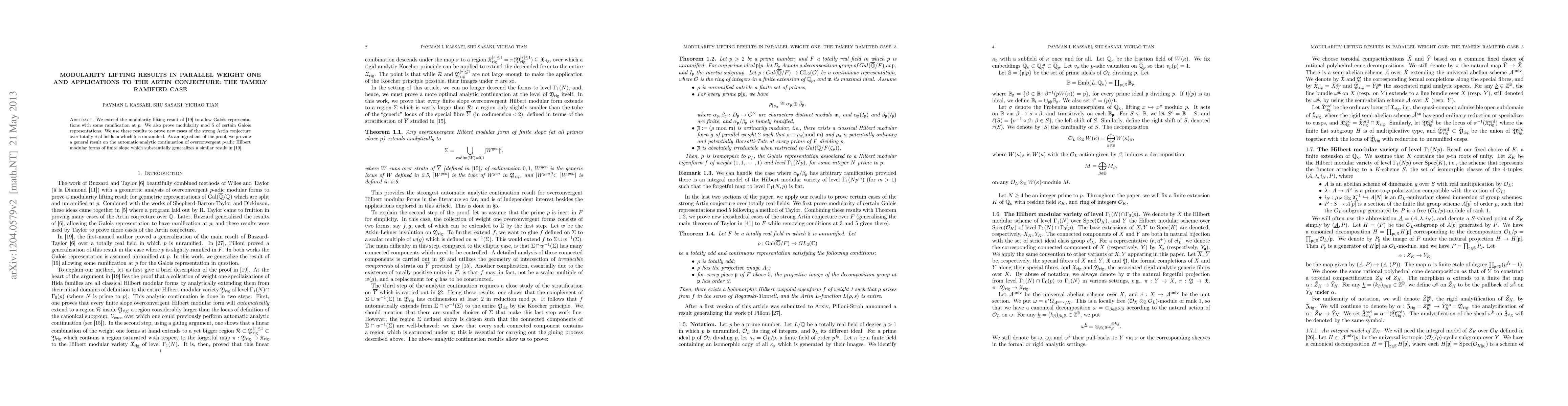 We extend the modularity lifting result of the arXiv:1111.2804 to allow Galois representations with some ramification at p. We also prove modularity mod 2 and 5 of certain Galois representations. We use these results to prove many new cases of the strong Artin conjecture over totally real fields in which 5 is unramified. As an ingredient of the proof, we provide a general result on the automatic analytic continuation of overconvergent p-adic Hilbert modular forms of finite slope which substantially generalizes a similar result in arXiv:1111.2804.