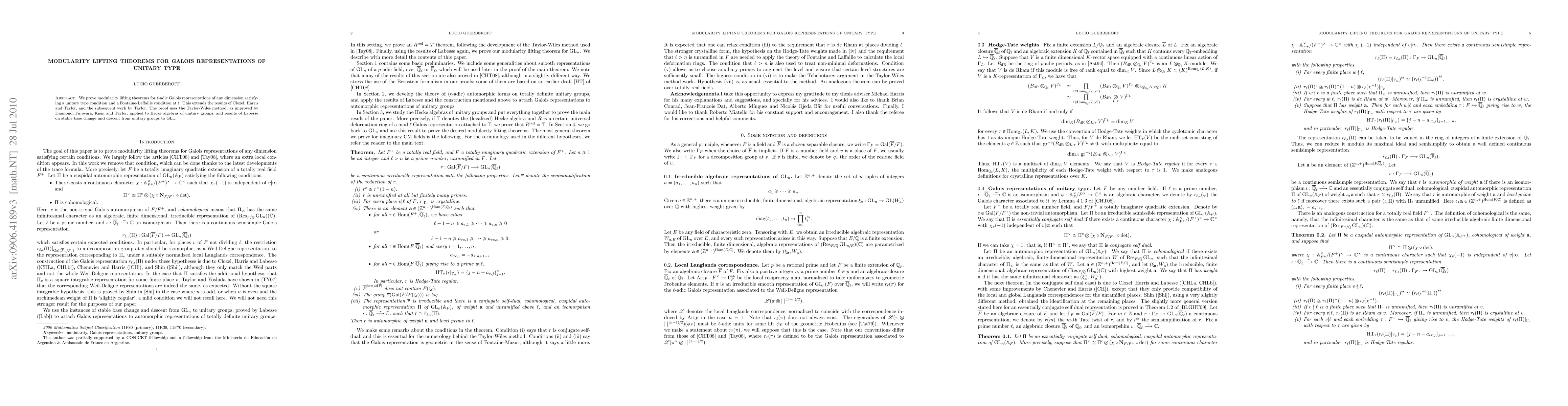 The paper proves modularity lifting theorems for l-adic Galois representations of unitary type, extending previous results using improved Taylor-Wiles method and stable base change theory.