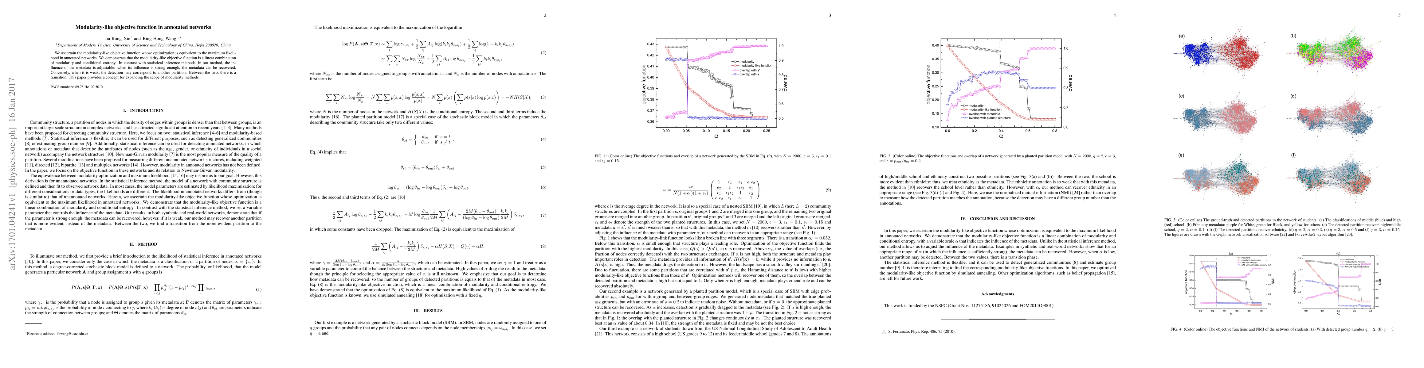 We ascertain the modularity-like objective function whose optimization is equivalent to the maximum likelihood in annotated networks. We demonstrate that the modularity-like objective function is a linear combination of modularity and conditional entropy. In contrast with statistical inference methods, in our method, the influence of the metadata is adjustable; when its influence is strong enough, the metadata can be recovered. Conversely, when it is weak, the detection may correspond to another partition. Between the two, there is a transition. This paper provides a concept for expanding the scope of modularity methods.
