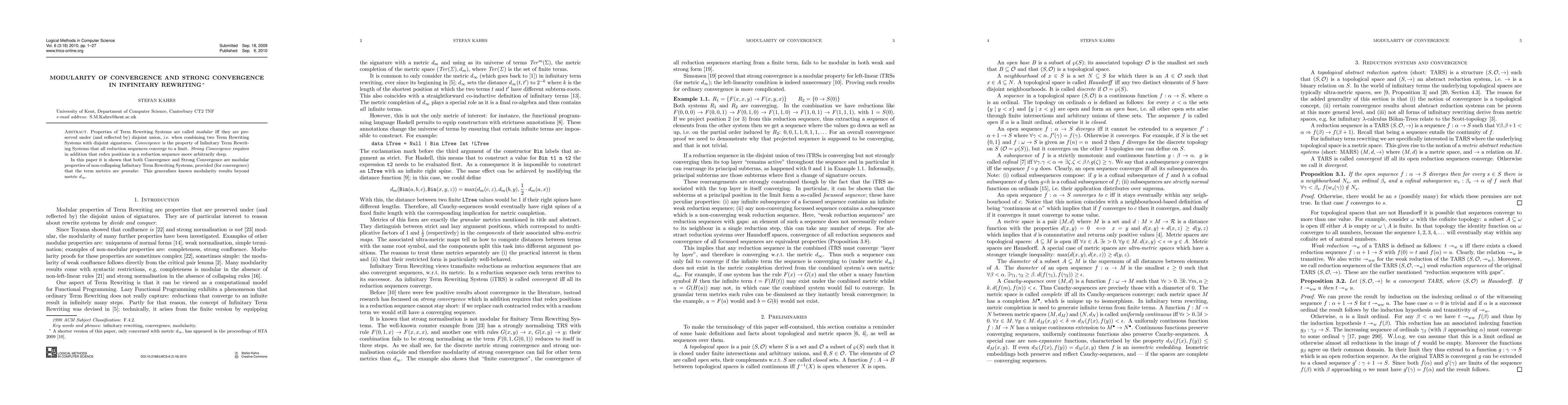 Properties of Term Rewriting Systems are called modular iff they are preserved under (and reflected by) disjoint union, i.e. when combining two Term Rewriting Systems with disjoint signatures. Convergence is the property of Infinitary Term Rewriting Systems that all reduction sequences converge to a limit. Strong Convergence requires in addition that redex positions in a reduction sequence move arbitrarily deep. In this paper it is shown that both Convergence and Strong Convergence are modular properties of non-collapsing Infinitary Term Rewriting Systems, provided (for convergence) that the term metrics are granular. This generalises known modularity results beyond metric \infty.