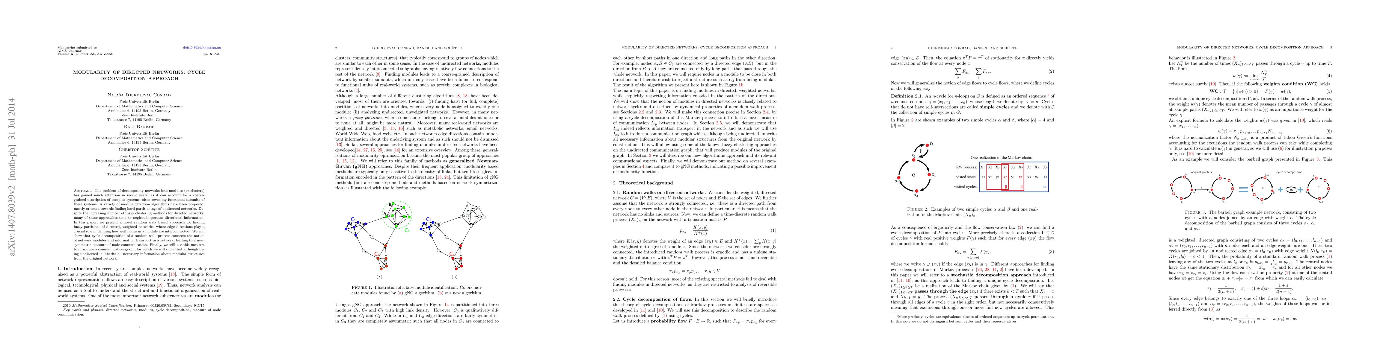 This paper introduces a novel random walk-based method for detecting fuzzy partitions in directed, weighted networks, emphasizing the importance of edge directions. It proposes a cycle decomposition approach that links network modules with information transport, resulting in a symmetric measure of node communication that retains directional information and modular structure.