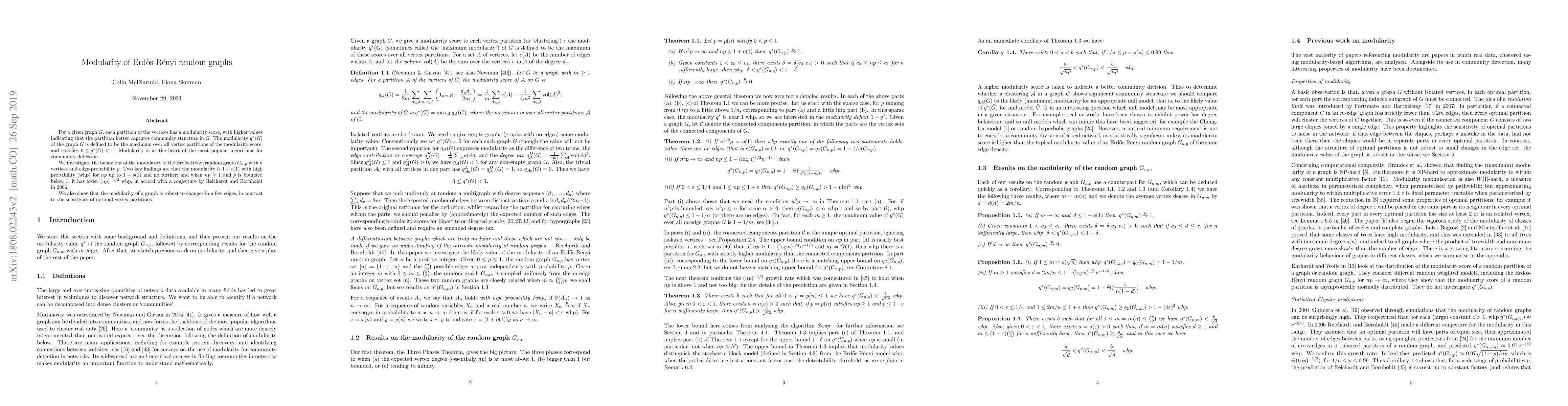 For a given graph $G$, each partition of the vertices has a modularity score, with higher values indicating that the partition better captures community structure in $G$. The modularity $q^*(G)$ of the graph $G$ is defined to be the maximum over all vertex partitions of the modularity score, and satisfies $0\leq q^*(G) < 1$. Modularity is at the heart of the most popular algorithms for community detection. We investigate the behaviour of the modularity of the Erd\H{o}s-R\'enyi random graph $G_{n,p}$ with $n$ vertices and edge-probability $p$. Two key findings are that the modularity is $1+o(1)$ with high probability (whp) for $np$ up to $1+o(1)$ and no further; and when $np \geq 1$ and $p$ is bounded below 1, it has order $(np)^{-1/2}$ whp, in accord with a conjecture by Reichardt and Bornholdt in 2006. We also show that the modularity of a graph is robust to changes in a few edges, in contrast to the sensitivity of optimal vertex partitions.