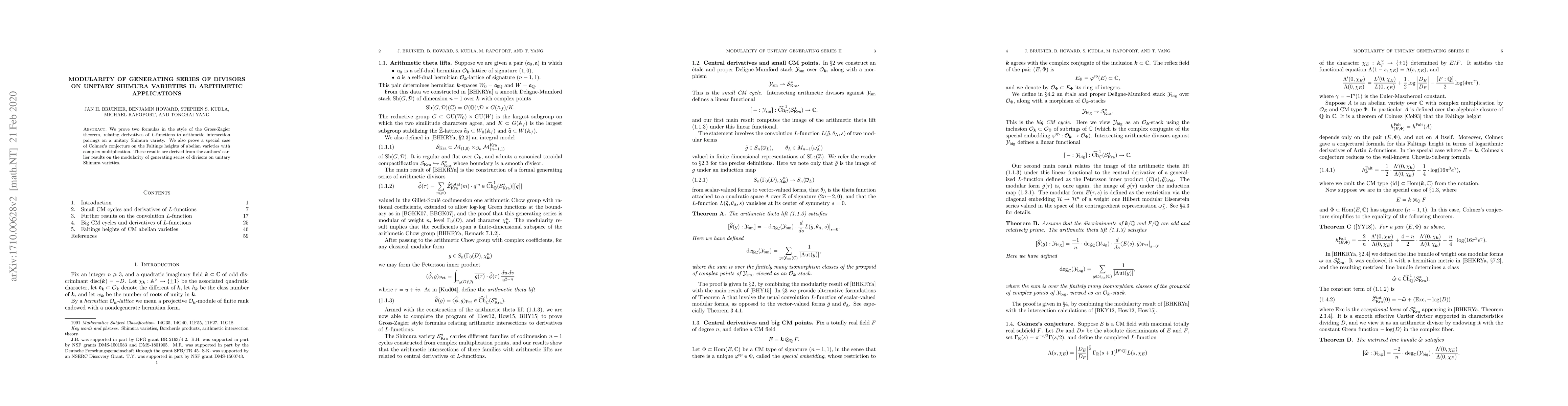 This paper establishes two Gross-Zagier type formulas linking L-function derivatives to arithmetic intersection pairings on unitary Shimura varieties and verifies a special case of Colmez's conjecture on the Faltings heights of abelian varieties, leveraging prior findings on the modularity of generating series of divisors.