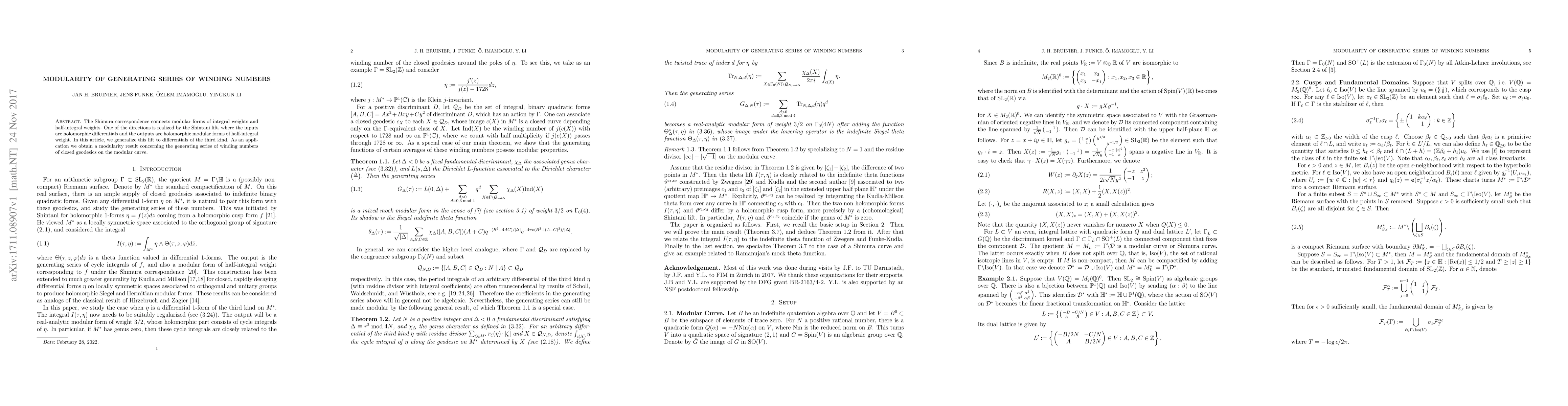 The Shimura correspondence connects modular forms of integral weights and half-integral weights. One of the directions is realized by the Shintani lift, where the inputs are holomorphic differentials and the outputs are holomorphic modular forms of half-integral weight. In this article, we generalize this lift to differentials of the third kind. As an application we obtain a modularity result concerning the generating series of winding numbers of closed geodesics on the modular curve.