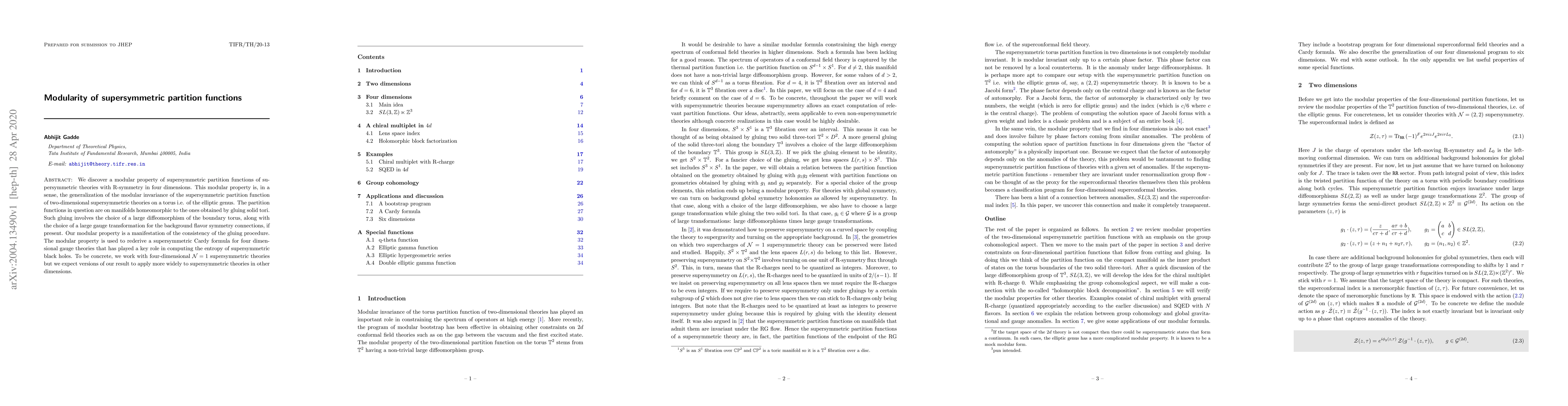 We discover a modular property of supersymmetric partition functions of supersymmetric theories with R-symmetry in four dimensions. This modular property is, in a sense, the generalization of the modular invariance of the supersymmetric partition function of two-dimensional supersymmetric theories on a torus i.e. of the elliptic genus. The partition functions in question are on manifolds homeomorphic to the ones obtained by gluing solid tori. Such gluing involves the choice of a large diffeomorphism of the boundary torus, along with the choice of a large gauge transformation for the background flavor symmetry connections, if present. Our modular property is a manifestation of the consistency of the gluing procedure. The modular property is used to rederive a supersymmetric Cardy formula for four-dimensional gauge theories that has played a key role in computing the entropy of supersymmetric black holes. To be concrete, we work with four-dimensional N=1 supersymmetric theories but we expect versions of our result to apply more widely to supersymmetric theories in other dimensions.