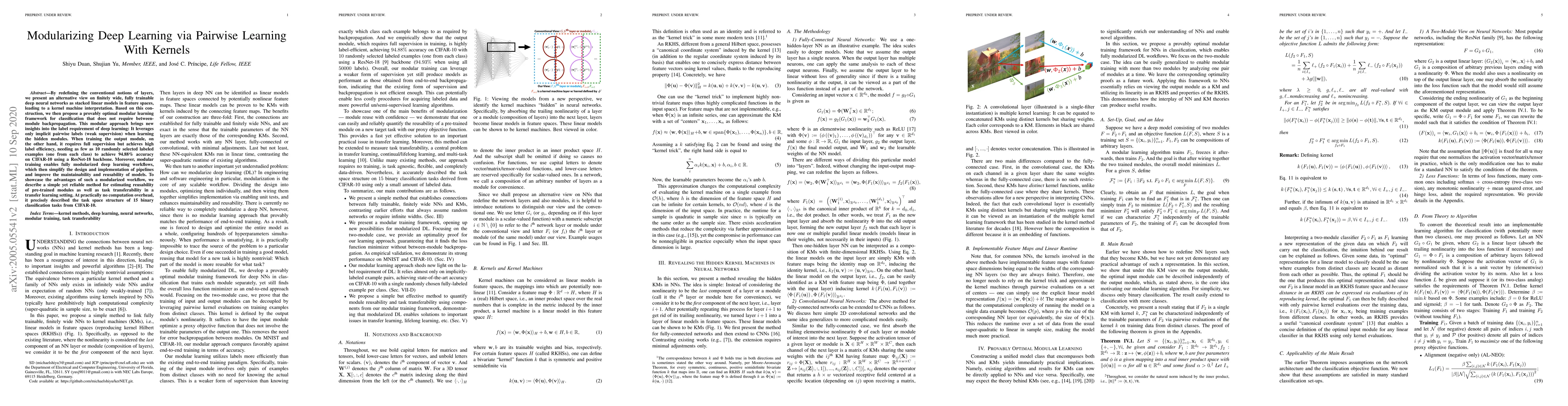 By redefining the conventional notions of layers, we present an alternative view on finitely wide, fully trainable deep neural networks as stacked linear models in feature spaces, leading to a kernel machine interpretation. Based on this construction, we then propose a provably optimal modular learning framework for classification that does not require between-module backpropagation. This modular approach brings new insights into the label requirement of deep learning: It leverages only implicit pairwise labels (weak supervision) when learning the hidden modules. When training the output module, on the other hand, it requires full supervision but achieves high label efficiency, needing as few as 10 randomly selected labeled examples (one from each class) to achieve 94.88% accuracy on CIFAR-10 using a ResNet-18 backbone. Moreover, modular training enables fully modularized deep learning workflows, which then simplify the design and implementation of pipelines and improve the maintainability and reusability of models. To showcase the advantages of such a modularized workflow, we describe a simple yet reliable method for estimating reusability of pre-trained modules as well as task transferability in a transfer learning setting. At practically no computation overhead, it precisely described the task space structure of 15 binary classification tasks from CIFAR-10.