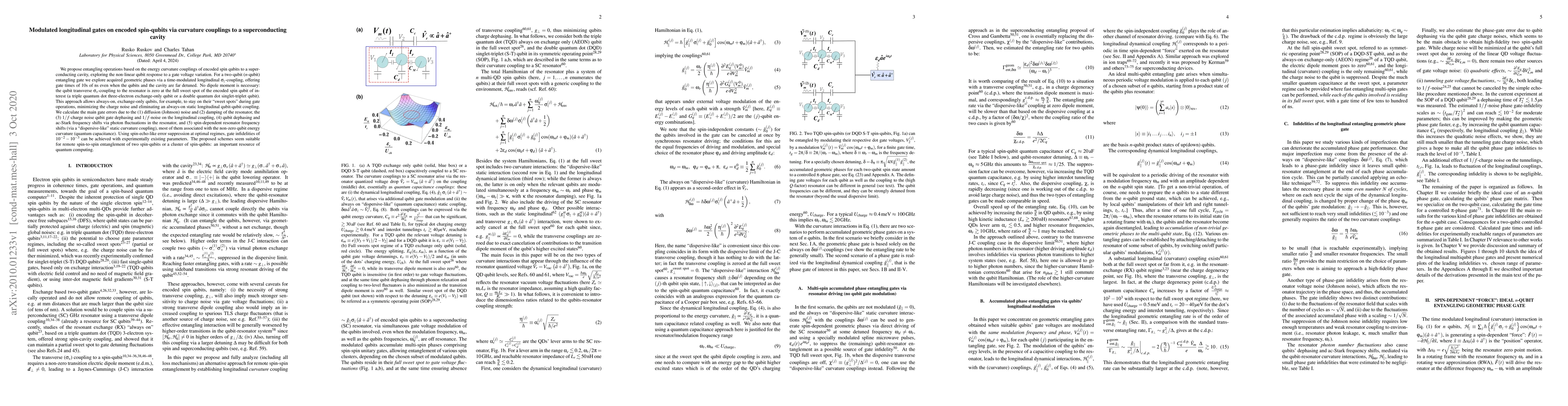 This paper proposes a method for entangling encoded spin qubits using curvature couplings to a superconducting cavity, achieving fast gate times via modulated longitudinal $\sigma_z$-couplings. The approach minimizes charge noise and avoids static longitudinal qubit-qubit coupling, while achieving low gate infidelities through error suppression techniques.