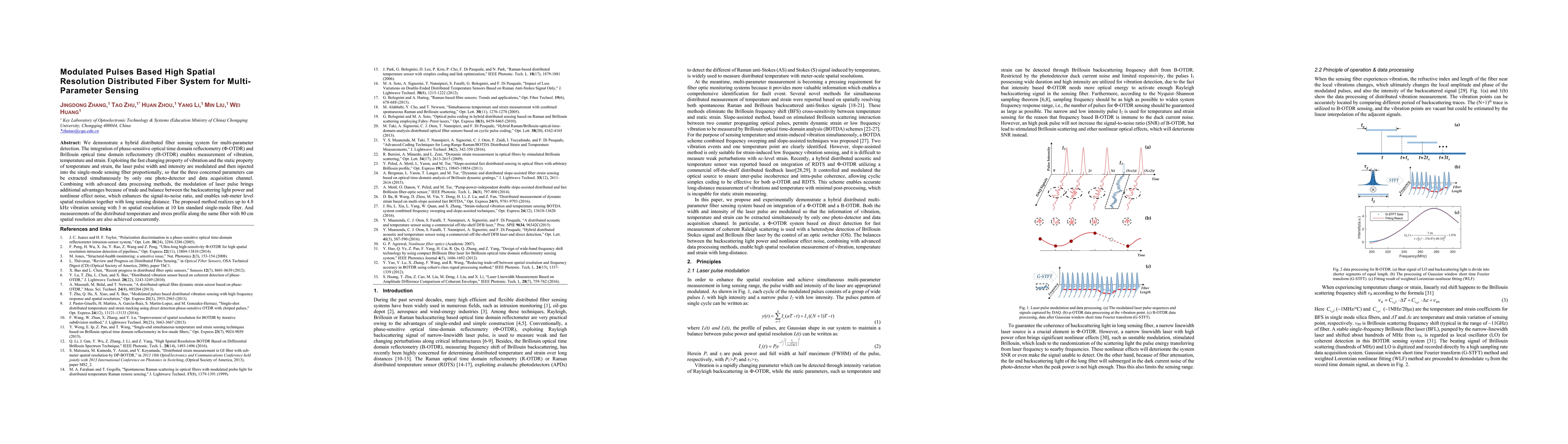 This paper presents a hybrid distributed fiber sensing system combining phase-sensitive optical time domain reflectometry and Brillouin optical time domain reflectometry for simultaneous multi-parameter detection of vibration, temperature, and strain. The method leverages modulated laser pulses to achieve high spatial resolution, enabling 4.8 kHz vibration sensing with 3 m resolution and concurrent temperature and strain measurements with 80 cm resolution over 10 km of fiber.