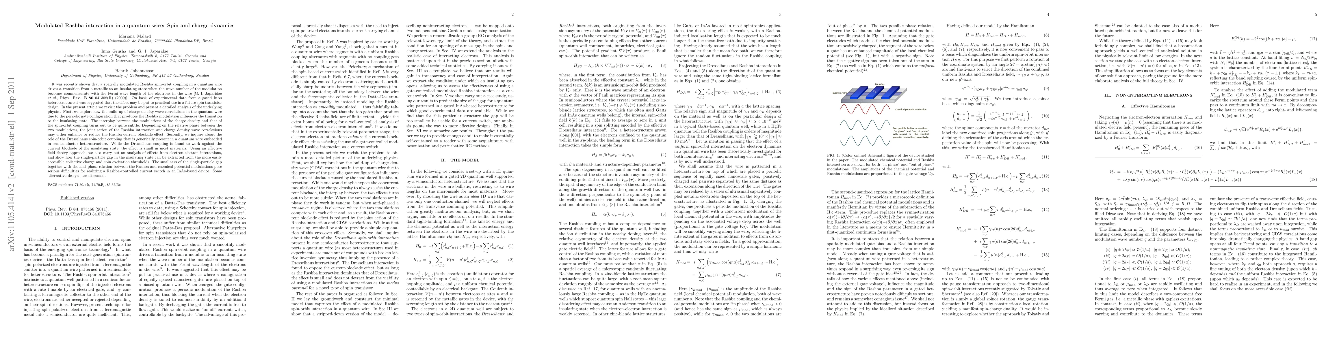 This paper investigates the transition from metallic to insulating states in quantum wires due to modulated Rashba spin-orbit coupling, emphasizing the interplay between spin and charge dynamics. It highlights the influence of charge density wave correlations and Dresselhaus coupling, and discusses the challenges for practical spin transistor designs in materials like InAs.