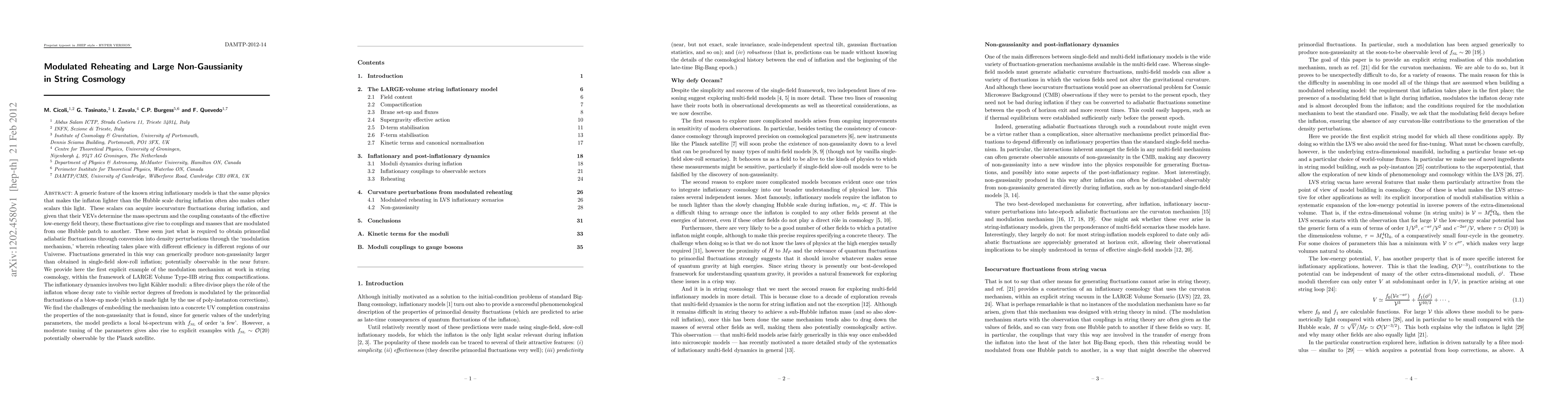 A generic feature of the known string inflationary models is that the same physics that makes the inflaton lighter than the Hubble scale during inflation often also makes other scalars this light. These scalars can acquire isocurvature fluctuations during inflation, and given that their VEVs determine the mass spectrum and the coupling constants of the effective low-energy field theory, these fluctuations give rise to couplings and masses that are modulated from one Hubble patch to another. These seem just what is required to obtain primordial adiabatic fluctuations through conversion into density perturbations through the `modulation mechanism', wherein reheating takes place with different efficiency in different regions of our Universe. Fluctuations generated in this way can generically produce non-gaussianity larger than obtained in single-field slow-roll inflation; potentially observable in the near future. We provide here the first explicit example of the modulation mechanism at work in string cosmology, within the framework of LARGE Volume Type-IIB string flux compactifications. The inflationary dynamics involves two light Kaehler moduli: a fibre divisor plays the role of the inflaton whose decay rate to visible sector degrees of freedom is modulated by the primordial fluctuations of a blow-up mode (which is made light by the use of poly-instanton corrections). We find the challenges of embedding the mechanism into a concrete UV completion constrains the properties of the non-gaussianity that is found, since for generic values of the underlying parameters, the model predicts a local bi-spectrum with fNL of order `a few'. However, a moderate tuning of the parameters gives also rise to explicit examples with fNL O(20) potentially observable by the Planck satellite.