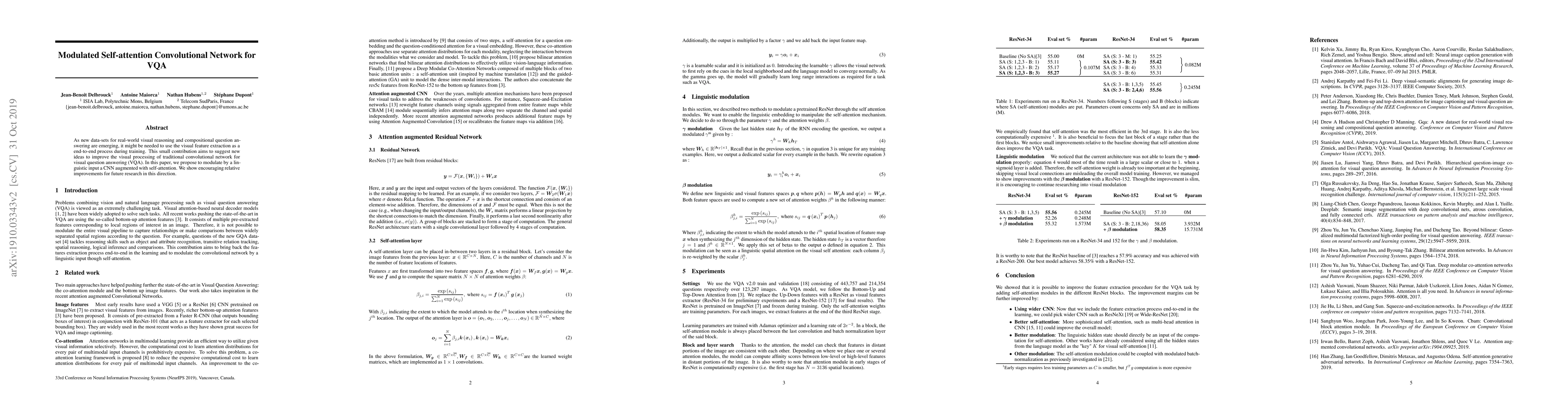 As new data-sets for real-world visual reasoning and compositional question answering are emerging, it might be needed to use the visual feature extraction as a end-to-end process during training. This small contribution aims to suggest new ideas to improve the visual processing of traditional convolutional network for visual question answering (VQA). In this paper, we propose to modulate by a linguistic input a CNN augmented with self-attention. We show encouraging relative improvements for future research in this direction.