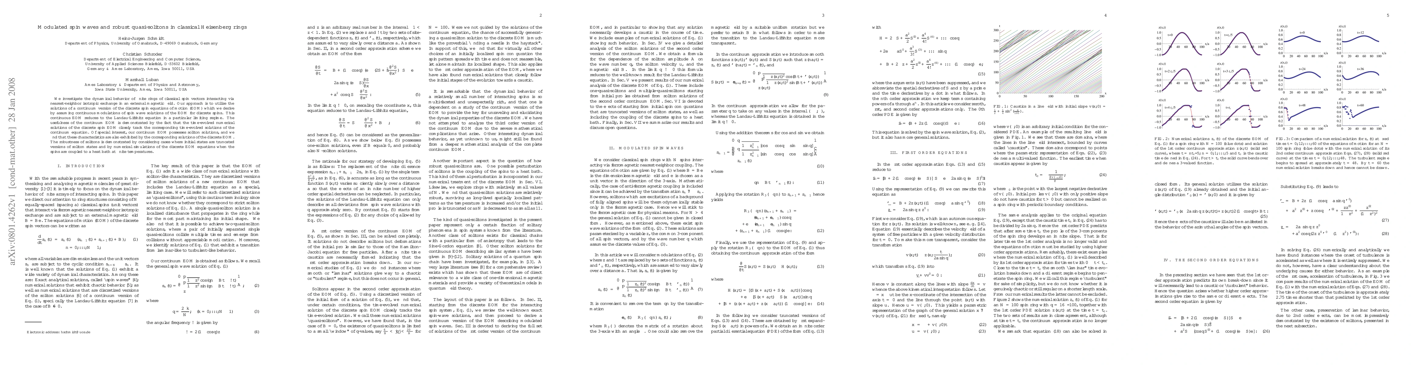We investigate the dynamical behavior of finite rings of classical spin vectors interacting via nearest-neighbor isotropic exchange in an external magnetic field. Our approach is to utilize the solutions of a continuum version of the discrete spin equations of motion (EOM) which we derive by assuming continuous modulations of spin wave solutions of the EOM for discrete spins. This continuous EOM reduces to the Landau-Lifshitz equation in a particular limiting regime. The usefulness of the continuum EOM is demonstrated by the fact that the time-evolved numerical solutions of the discrete spin EOM closely track the corresponding time-evolved solutions of the continuum equation. Of special interest, our continuum EOM possesses soliton solutions, and we find that these characteristics are also exhibited by the corresponding solutions of the discrete EOM. The robustness of solitons is demonstrated by considering cases where initial states are truncated versions of soliton states and by numerical simulations of the discrete EOM equations when the spins are coupled to a heat bath at finite temperatures.