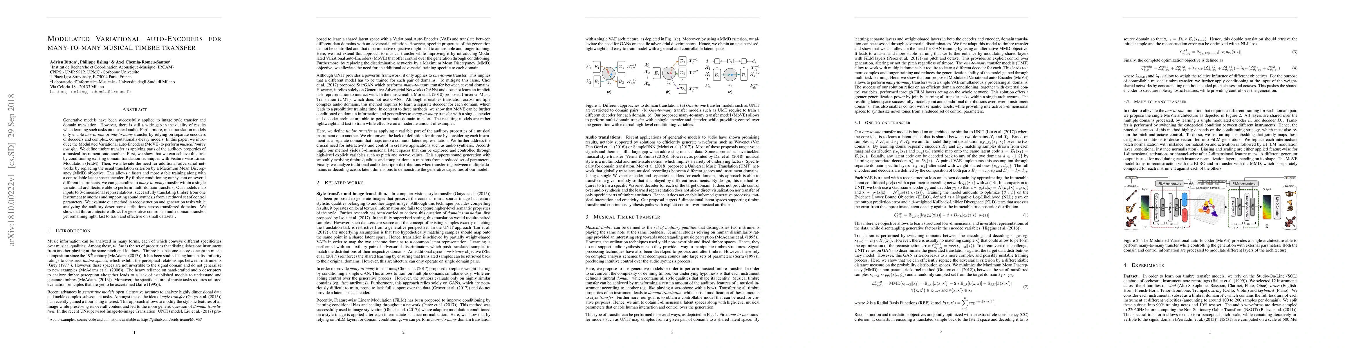 This paper introduces Modulated Variational auto-Encoders (MoVE) for many-to-many musical timbre transfer, achieving timbre transfer through conditioned domain translation with Feature-wise Linear Modulation and a Maximum Mean Discrepancy objective. The proposed method enables efficient, stable training and multi-domain transfers within a single architecture.