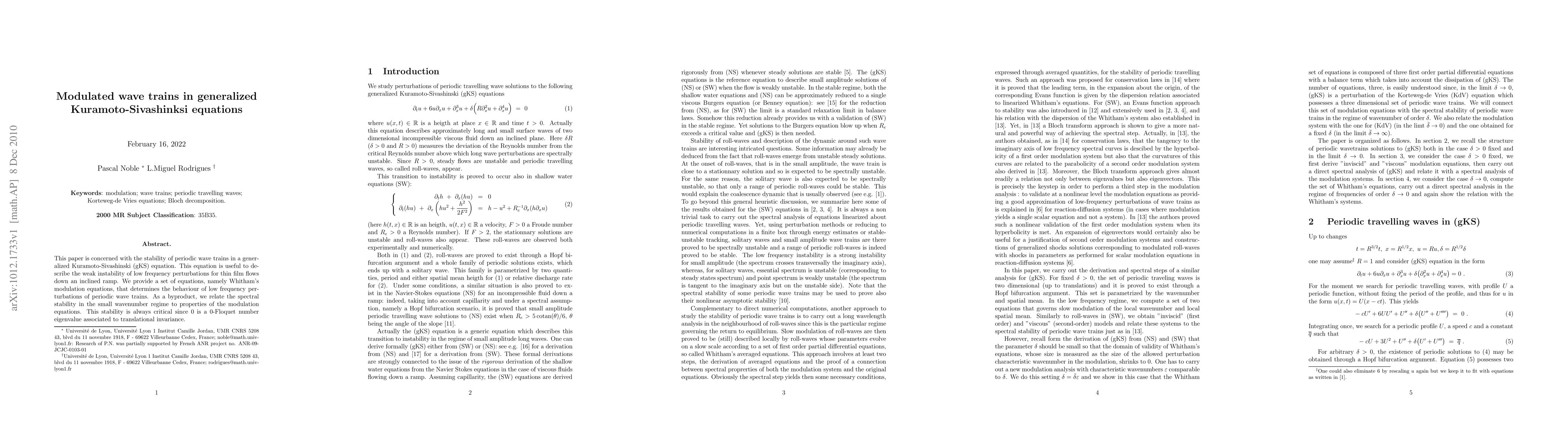 This paper investigates the stability of periodic wave trains in the generalized Kuramoto-Sivashinski equation, which models thin film flows. It uses Whitham's modulation equations to analyze low-frequency perturbations and relates spectral stability to properties of the modulation equations, highlighting the critical nature of stability due to a zero-Floquet number eigenvalue.