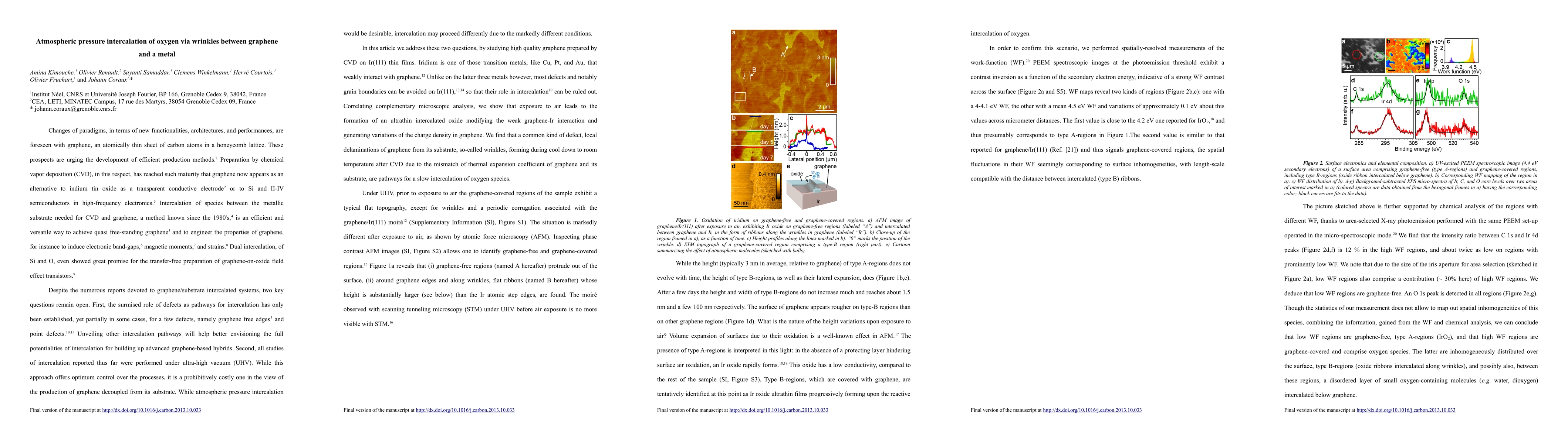 The intercalation of an oxide barrier between graphene and its metallic substrate for chem- ical vapor deposition is a contamination-free alternative to the transfer of graphene to dielectric supports, usually needed for the realization of electronic devices. Low-cost pro- cesses, especially at atmospheric pressure, are desirable but whether they are achievable remains an open question. Combining complementary microscopic analysis, providing structural, electronic, vibrational, and chemical information, we demonstrate the spontaneous reactive intercalation of 1.5 nm-thick oxide ribbons between graphene and an iridium substrate, at atmospheric pressure and room temperature. We discover that oxygen-containing molecules needed for forming the ribbons are supplied through the graphene wrinkles, which act as tunnels for the efficient diffusion of molecules entering their free end. The intercalated oxide ribbons are found to modify the graphene-support interaction, leading to the formation of quasi-free-standing high quality graphene whose charge density is modulated in few 10-100 nm-wide ribbons by a few 10^12 cm-2, where the inelastic optical response is changed, due to a softening of vibrational modes - red-shifts of Raman G and 2D bands by 6 and 10 cm-1, respectively.