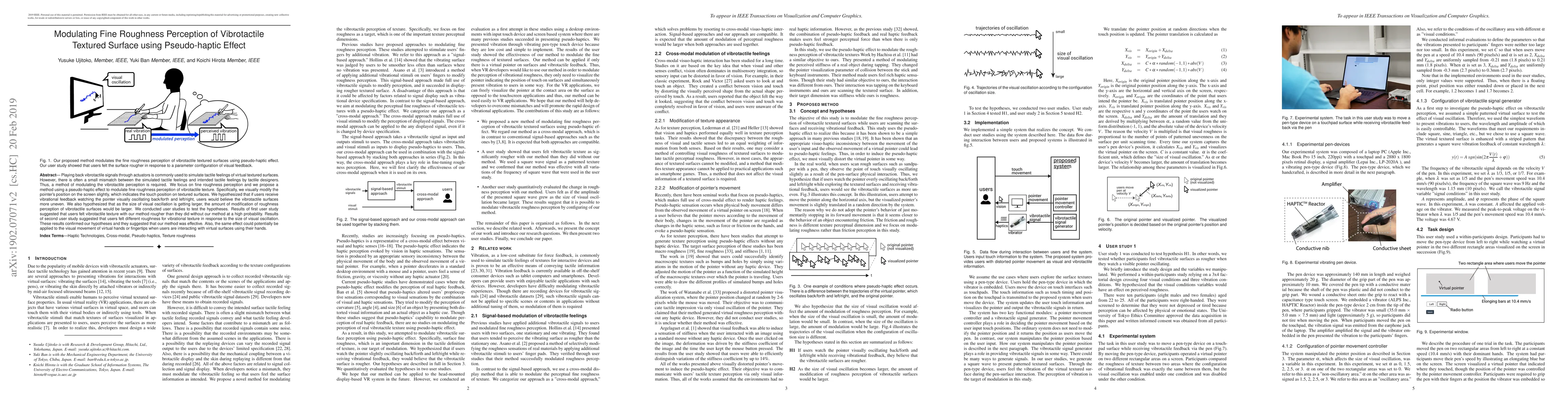 This paper proposes a method to modulate the perception of fine roughness in vibrotactile textured surfaces using a pseudo-haptic effect, where visual oscillation of a pointer on the screen influences users' tactile perception. User studies confirmed that larger visual oscillations increased perceived roughness, validating the effectiveness of the method.