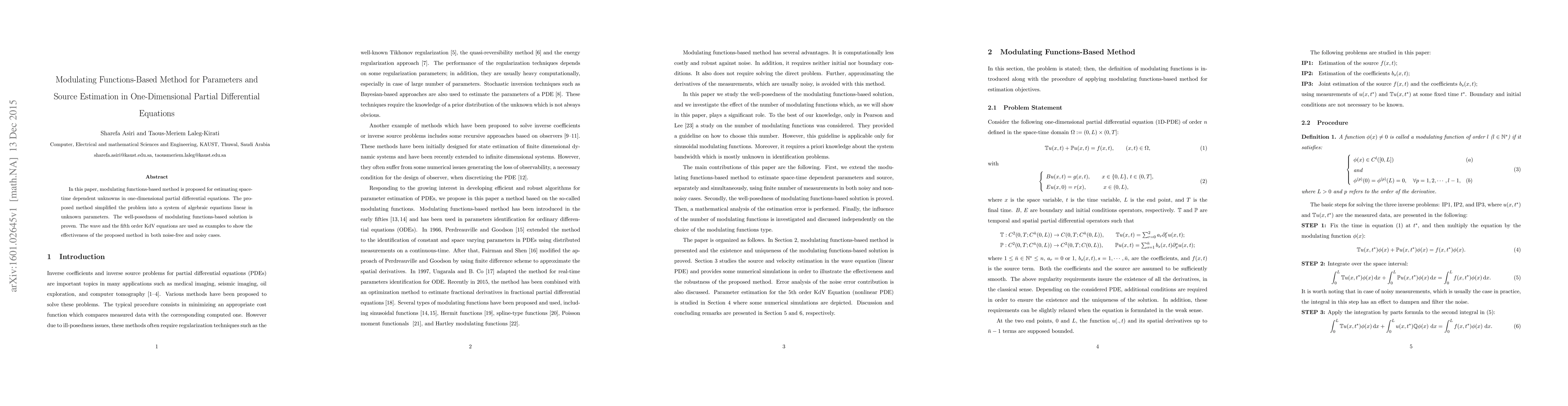This paper introduces a modulating functions-based method for estimating parameters and sources in one-dimensional partial differential equations, transforming the problem into a system of linear algebraic equations. The method's effectiveness is demonstrated through applications to the wave and fifth order KdV equations in both noise-free and noisy scenarios.