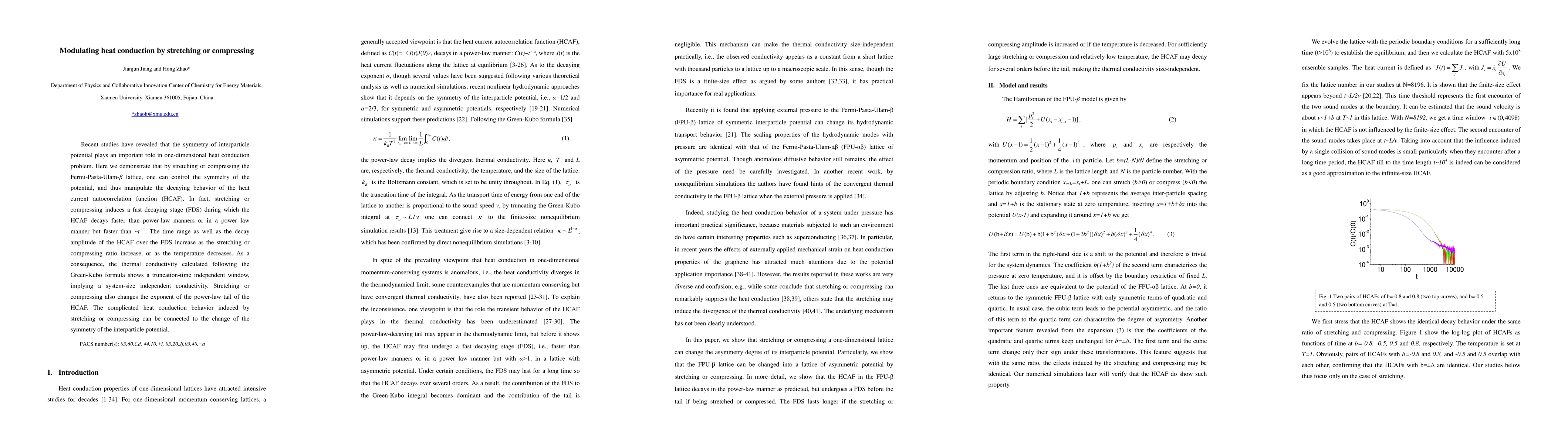 Recent studies have revealed that the symmetry of interparticle potential plays an important role in one-dimensional heat conduction problem. Here we demonstrate that by stretching or compressing the Fermi-Pasta-Ulam-\b{eta} lattice, one can control the symmetry of the potential, and thus manipulate the decaying behavior of the heat current autocorrelation function (HCAF). In fact, stretching or compressing induces a fast decaying stage (FDS) during which the HCAF decays faster than power-law manners or in a power law manner but faster than ~t -1. The time range as well as the decay amplitude of the HCAF over the FDS increase as the stretching or compressing ratio increase, or as the temperature decreases. As a consequence, the thermal conductivity calculated following the Green-Kubo formula shows a truncation-time independent window, implying a system-size independent conductivity. Stretching or compressing also changes the exponent of the power-law tail of the HCAF. The complicated heat conduction behavior induced by stretching or compressing can be connected to the change of the symmetry of the interparticle potential.