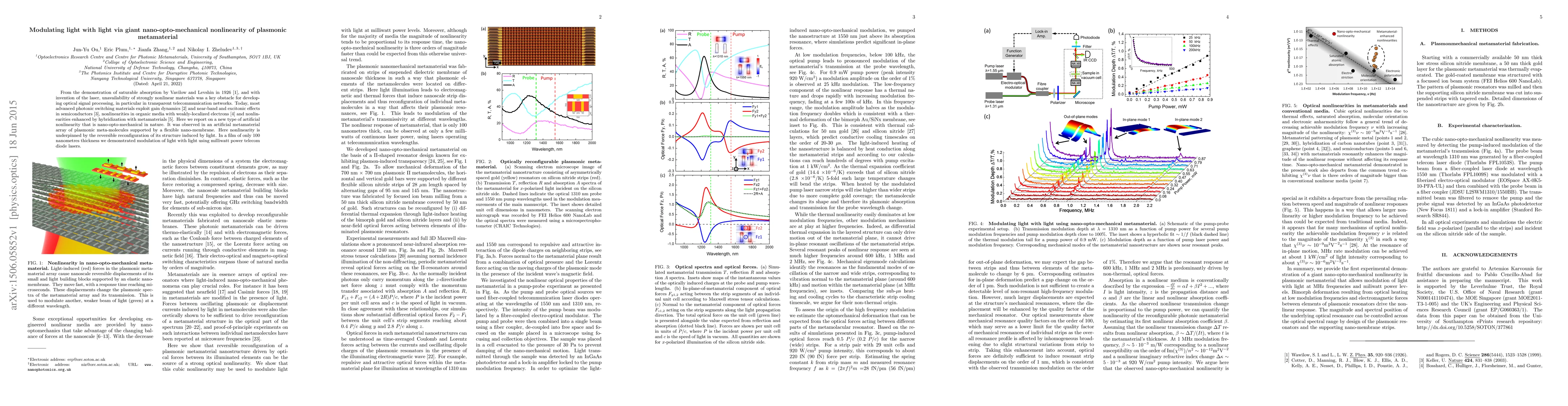 This paper reports on a novel nano-opto-mechanical nonlinearity in plasmonic metamaterial, enabling light modulation via structural changes induced by light, overcoming traditional material limitations for optical signal processing in telecommunication networks. The study demonstrates this effect in a 100 nm thick film using telecom diode lasers at milliwatt power levels.