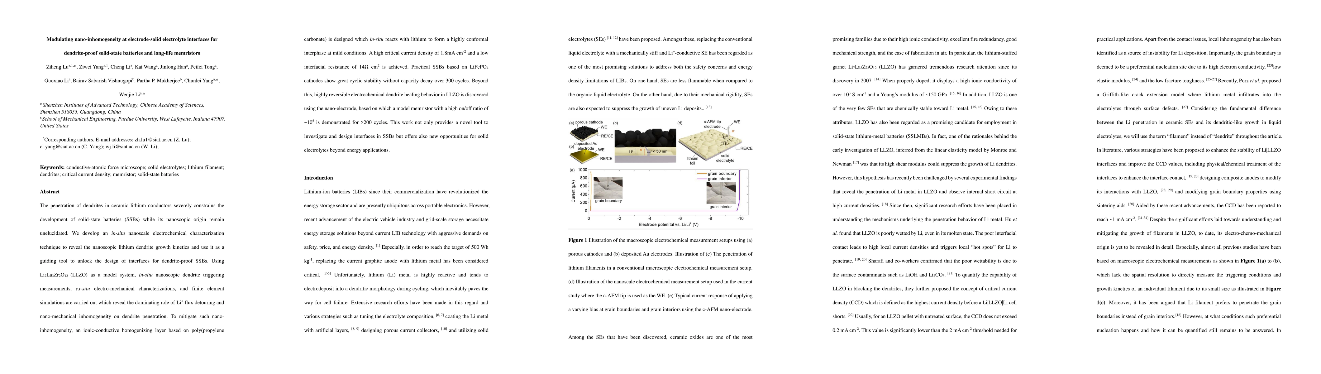 This paper develops an in-situ nanoscale technique to study lithium dendrite growth and proposes a new ionic-conductive homogenizing layer to mitigate nano-inhomogeneity in solid-state batteries, achieving high cyclic stability and reversible dendrite healing. The approach also enables a model memristor with excellent performance.