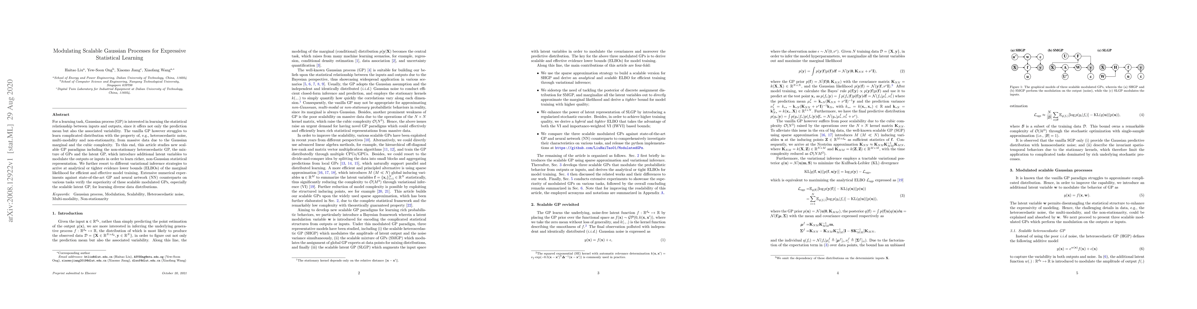 For a learning task, Gaussian process (GP) is interested in learning the statistical relationship between inputs and outputs, since it offers not only the prediction mean but also the associated variability. The vanilla GP however struggles to learn complicated distribution with the property of, e.g., heteroscedastic noise, multi-modality and non-stationarity, from massive data due to the Gaussian marginal and the cubic complexity. To this end, this article studies new scalable GP paradigms including the non-stationary heteroscedastic GP, the mixture of GPs and the latent GP, which introduce additional latent variables to modulate the outputs or inputs in order to learn richer, non-Gaussian statistical representation. We further resort to different variational inference strategies to arrive at analytical or tighter evidence lower bounds (ELBOs) of the marginal likelihood for efficient and effective model training. Extensive numerical experiments against state-of-the-art GP and neural network (NN) counterparts on various tasks verify the superiority of these scalable modulated GPs, especially the scalable latent GP, for learning diverse data distributions.