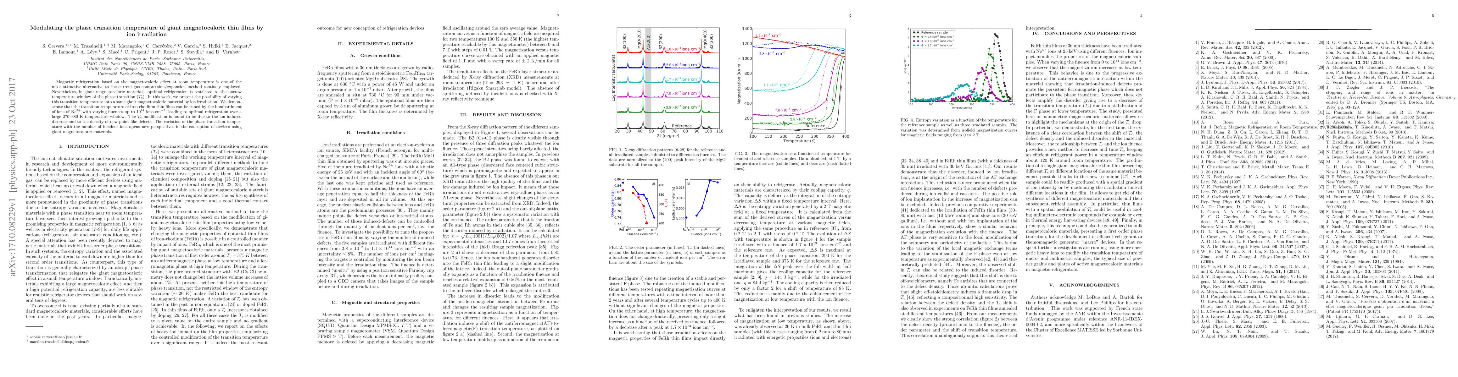This research demonstrates that the phase transition temperature of giant magnetocaloric iron rhodium thin films can be tuned by ion irradiation, specifically with Ne 5+ ions, allowing for optimal refrigeration over a wider temperature range of 270-380 K. The shift in transition temperature is attributed to ion-induced disorder and the creation of new point-like defects.