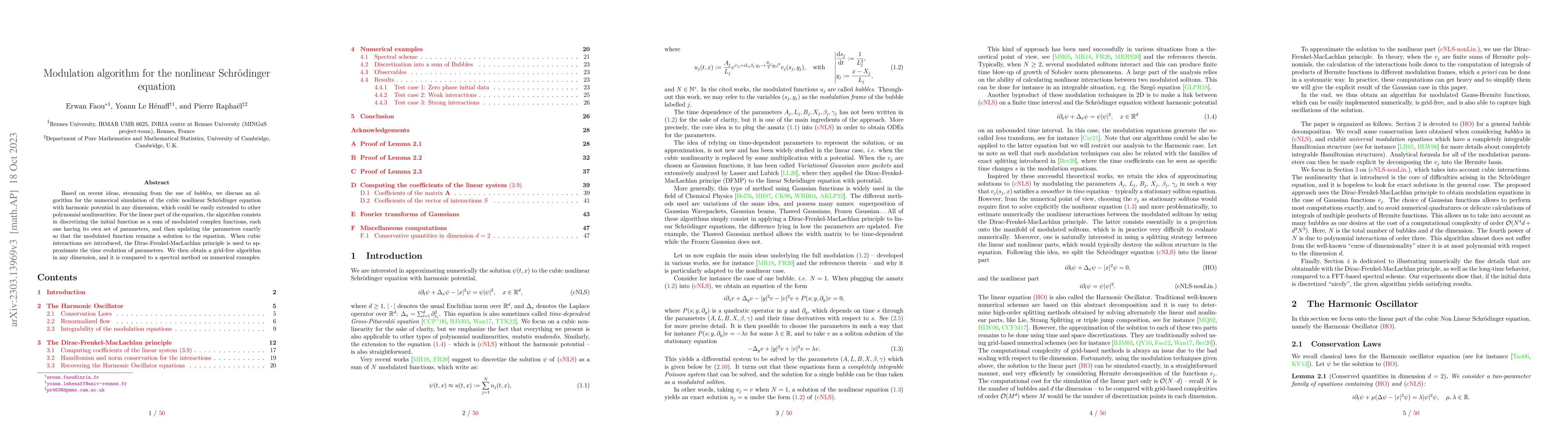 Based on recent ideas, stemming from the use of bubbles, we discuss an algorithm for the numerical simulation of the cubic nonlinear Schr{\"o}dinger equation with harmonic potential in any dimension, which could be easily extended to other polynomial nonlinearities. For the linear part of the equation, the algorithm consists in discretizing the initial function as a sum of modulated complex functions, each one having its own set of parameters, and then updating the parameters exactly so that the modulated function remains a solution to the equation. When cubic interactions are introduced, the Dirac-Frenkel-MacLachlan principle is used to approximate the time evolution of parameters. We then obtain a grid-free algorithm in any dimension, and it is compared to a spectral method on numerical examples.