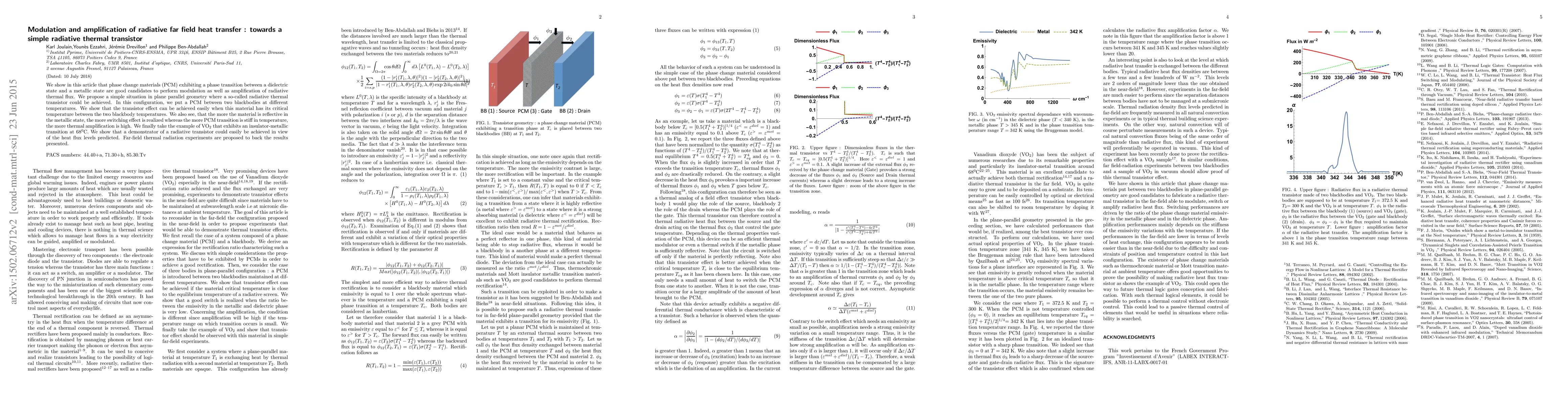 The paper introduces a novel radiative thermal transistor concept based on phase change materials, demonstrating modulation, amplification, and switching of radiative thermal flux in a far-field plane-parallel geometry.