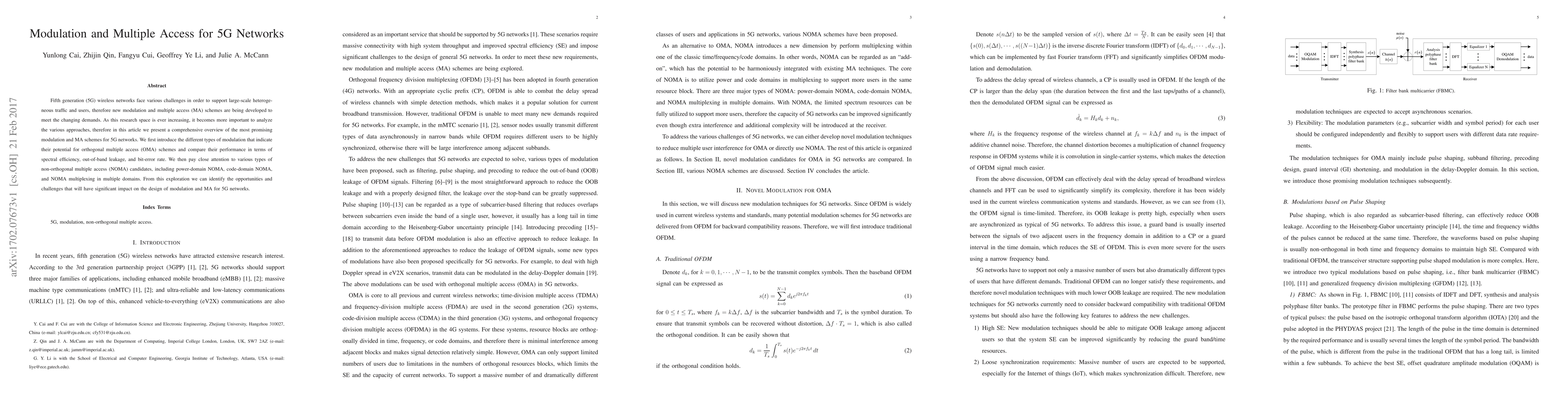 This paper provides an extensive review of modulation and multiple access schemes for 5G networks, focusing on both orthogonal and non-orthogonal methods. It evaluates their performance in terms of spectral efficiency, out-of-band leakage, and bit-error rate, highlighting the challenges and opportunities for future 5G design.