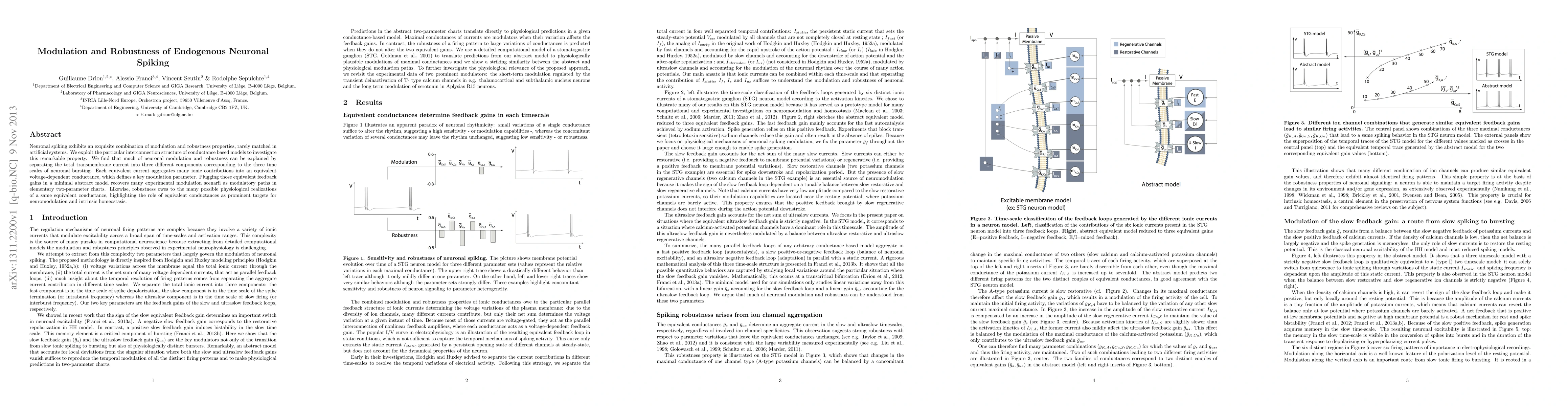 Neuronal spiking exhibits an exquisite combination of modulation and robustness properties, rarely matched in artificial systems. We exploit the particular interconnection structure of conductance based models to investigate this remarkable property. We find that much of neuronal modulation and robustness can be explained by separating the total transmembrane current into three different components corresponding to the three time scales of neuronal bursting. Each equivalent current aggregates many ionic contributions into an equivalent voltage-dependent conductance, which defines a key modulation parameter. Plugging those equivalent feedback gains in a minimal abstract model recovers many experimental modulation scenarii as modulatory paths in elementary two-parameter charts. Likewise, robustness owes to the many possible physiological realizations of a same equivalent conductance, highlighting the role of equivalent conductances as prominent targets for neuromodulation and intrinsic homeostasis.