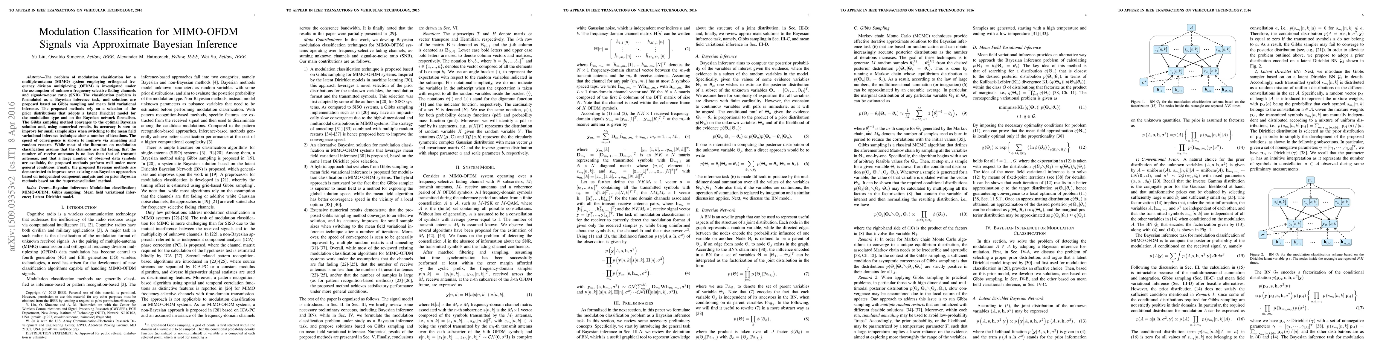 This paper proposes Bayesian inference methods for modulation classification in MIMO-OFDM systems under unknown frequency-selective fading and SNR conditions. It utilizes Gibbs sampling and mean field variational inference, showing improved accuracy and convergence speed, and outperforms existing non-Bayesian and prior Bayesian methods.